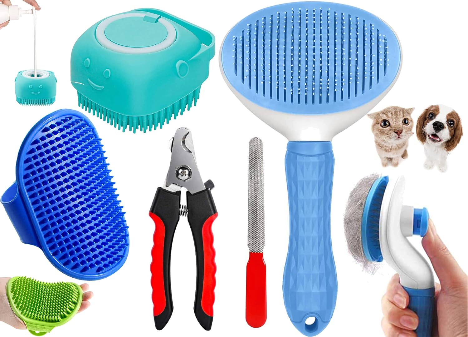 Give your furry friends the ultimate grooming experience with the Stylllent 4-in-1 Pet Grooming Set. This all-in-one combo includes a self-cleaning slicker brush, silicone bath and massage brush, adjustable rubber scrubber, and ergonomic nail clippers – making it the perfect solution for maintaining your pet’s hygiene, comfort, and appearance at home.