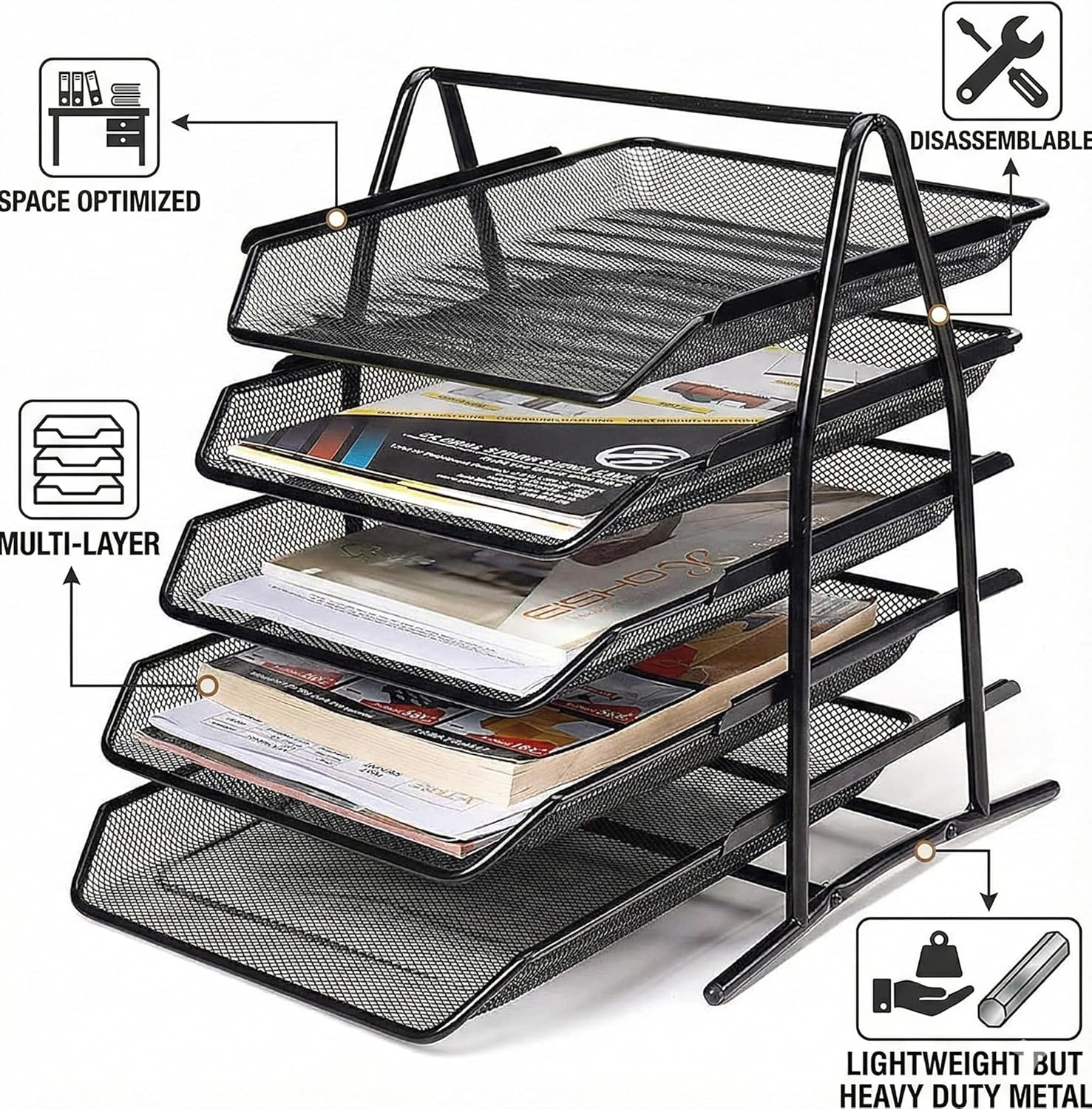 A convenient 5 tier document storage rack made of mesh metal. Perfect for home and office use