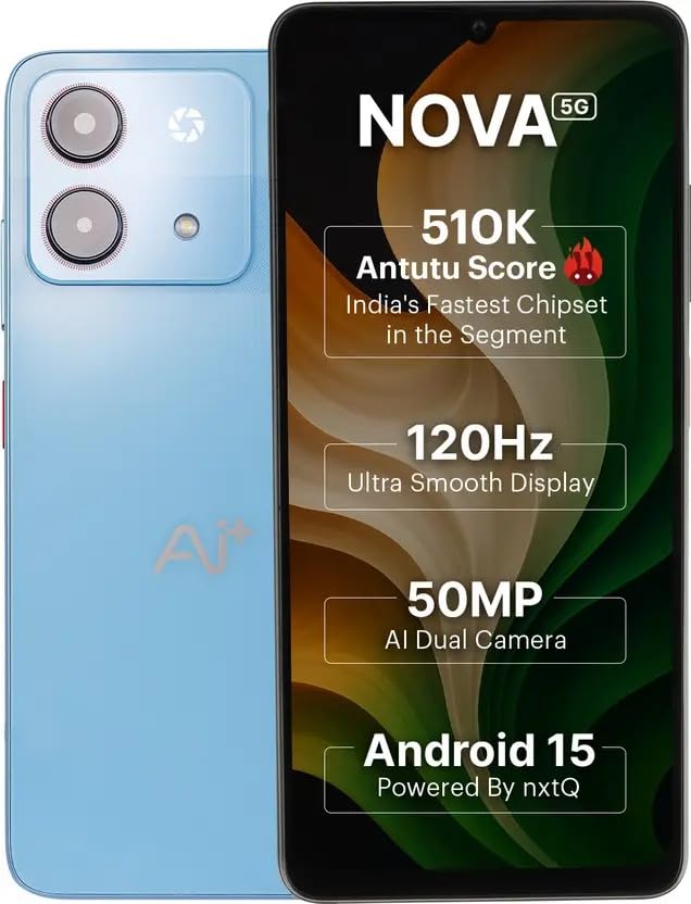 The Ai+ Nova smartphone comes with the Unisoc T8200 8-core processor with a 510K+ AnTuTu score for smooth performance. Enjoy blazing fast 5G connectivity with Dual SIM, ideal for smooth multitasking. Capture stunning shots with the 50 MP AI dual camera and watch ultra-smooth visuals on a 120 Hz screen. Powered with Android 15 with nxtQ, it offers improved speed, personalization, and built-in privacy features to safeguard your data in place.