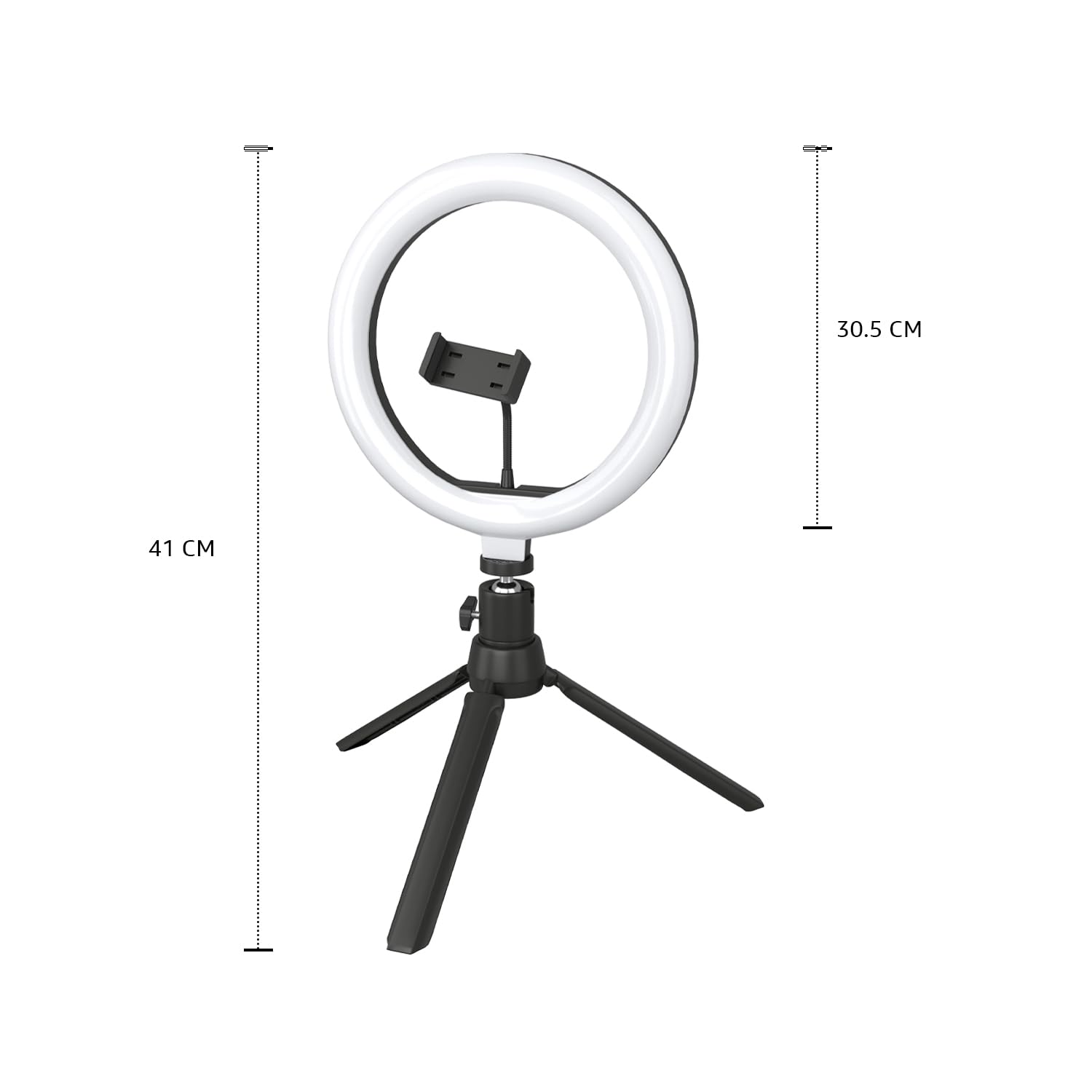 Dimensions: Mobile Holder – 5.6 – 8.7 cm Folded Ring Light Height – 19.5 cm Ring Light Height – 30.5 cm Ring Light Min Height – 41 cm Ring Light Max Height – 52.7 cm
