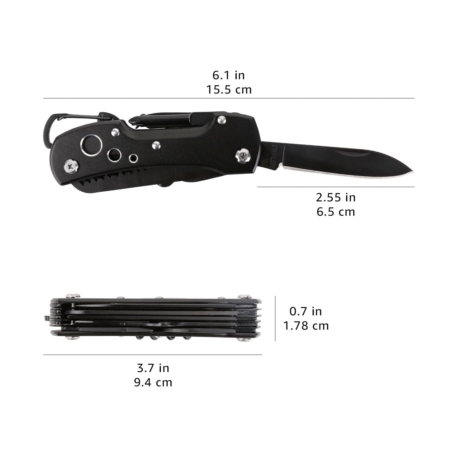 Details Multi-tool pocket knife 15 popular tools all in one place Stainless steel with black oxidation finish and aluminum handle Includes a nylon pouch with belt loop Great for hiking, backpacking, camping, fishing, and more