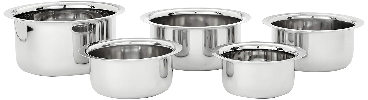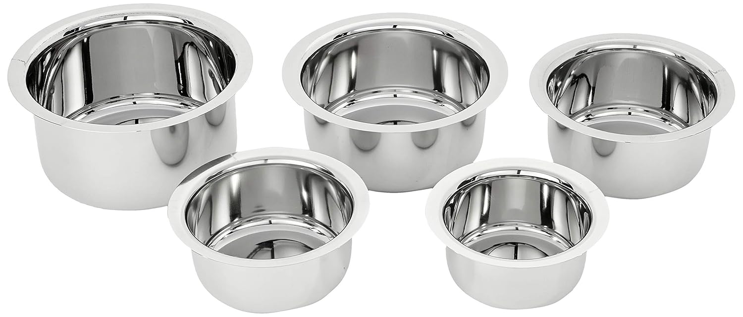 Amazon Brand – Solimo Tope Set of 5 | Stainless Steel | 420 ml, 550 ml, 840 ml, 1150 ml & 1550 ml | Induction and Gas compatible | Silver