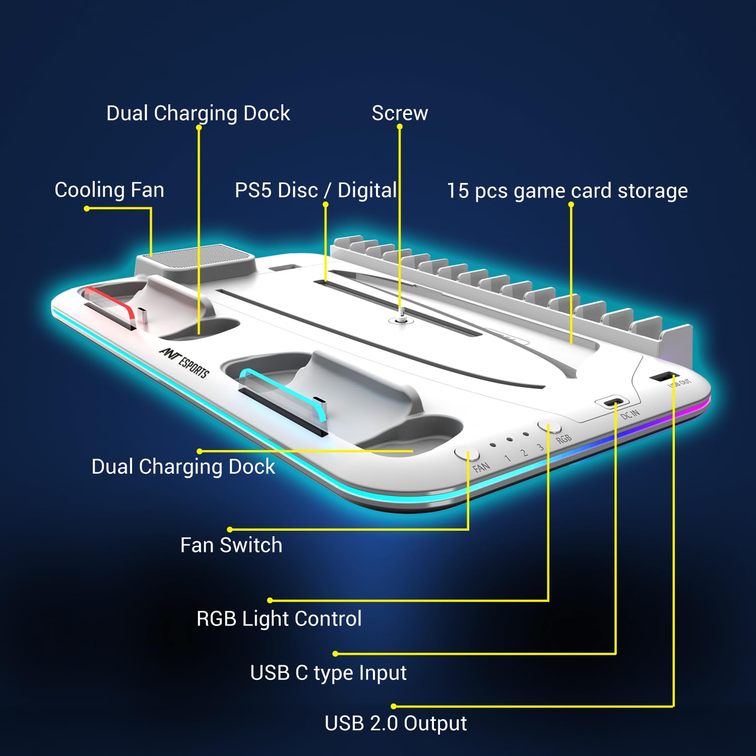 Ant Esports Dock5 RGB Cooling and Charging Station for PS5 with Cooling Fan and Dual Controller Charger Station for Playstation 5 PS5 Console Disc & Digital Edition, PS5 Cooling Station PS5 Accessories with RGB Light/Headset Holder/6 Game Slots/Screw (White)