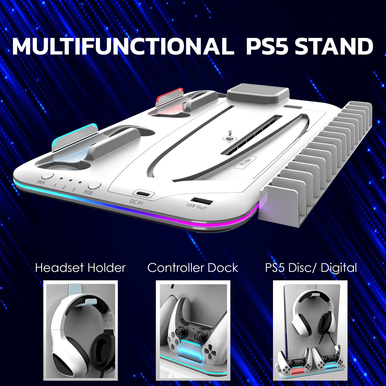 【All In One PS5 Cooling Stand With Cool RGB Light】This ps5 stand has built-in RGB light stripes of different colors to create a cool game scene, which gives you a stunning look and use feeling.The ps5 stand has an extras RGB light control switch, you can choose the RGB light to breathing color, fixed color or off. The ps5 stand with efficient cooling fan and dualsense controllers charger station, 6 removable game slots, headset holder, dust-proof holder and c to c charging cable.