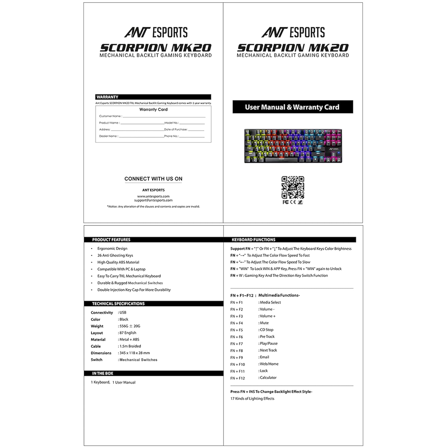 Be the first to review “Ant Esports Scorpion MK20 Wired 75% Mechanical Gaming Keyboard, 87 Keys Compact TKL Wired Linear Red Switches Detachable USB RGB Backlight Keyboard”