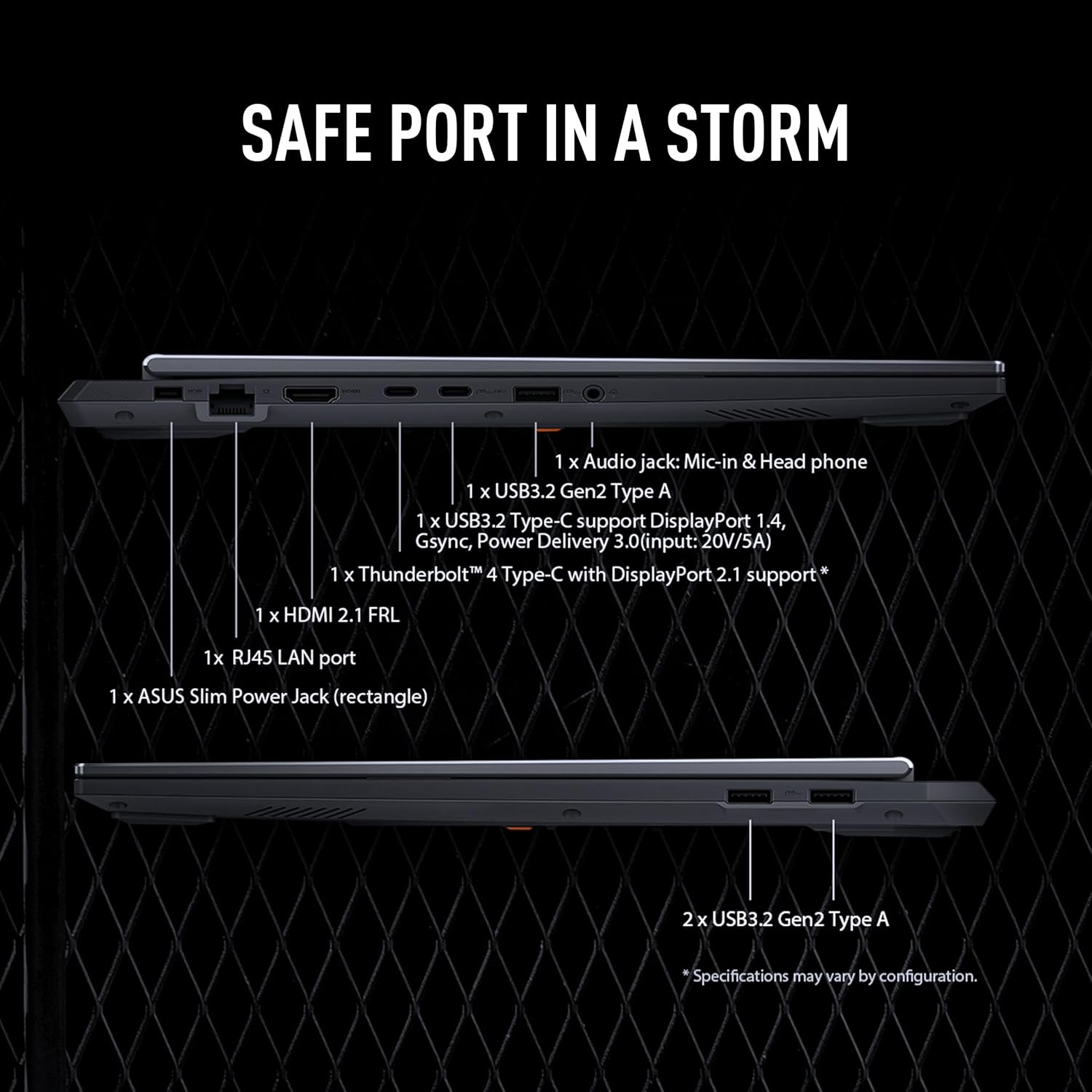 I/O Ports : 1x RJ45 LAN port, 1x Thunderbolt 4 with support for DisplayPort / G-SYNC (data speed up to 40Gbps), 1x USB 3.2 Gen 2 Type-C with support for DisplayPort / power delivery (data speed up to 10Gbps), 3x USB 3.2 Gen 2 Type-A (data speed up to 10Gbps), 1x HDMI 2.1 FRL, 1x 3.5mm Combo Audio Jack
