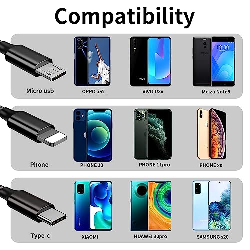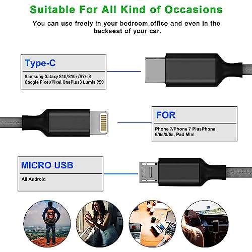 3-in-1 Multi Charging Cable: Includes Micro USB and Type-C connectors, compatible with Android, iOS, and Type-C devices for universal charging.