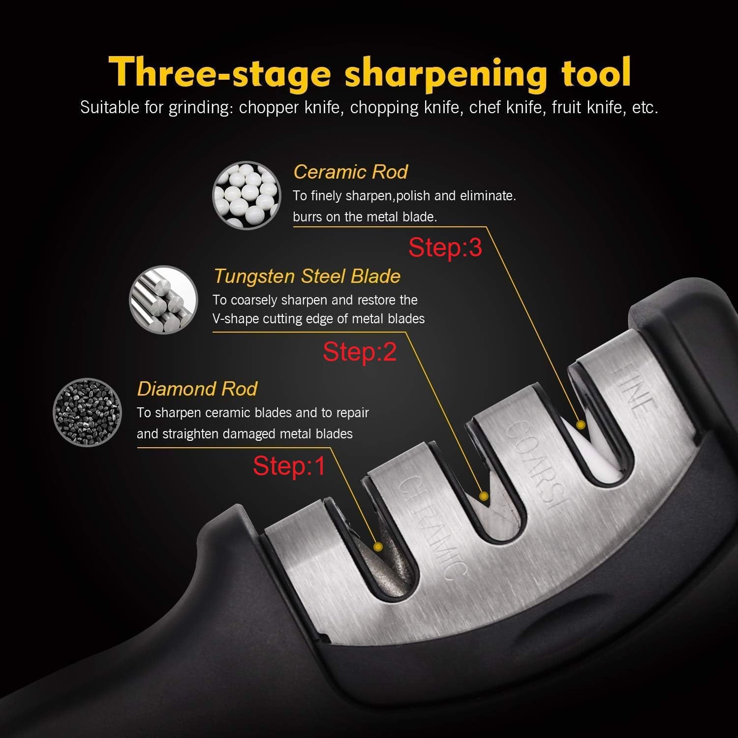 3-STEP KNIFE SHARPENING SYSTEM: Knife sharpener tool has 1st diamond sharpening slot repairs and straightens damaged blades. Middle Tungsten Steel slot sharpens to restore its V-shape. Finally, the 3rd Ceramic slot fine tunes for a clean polish.