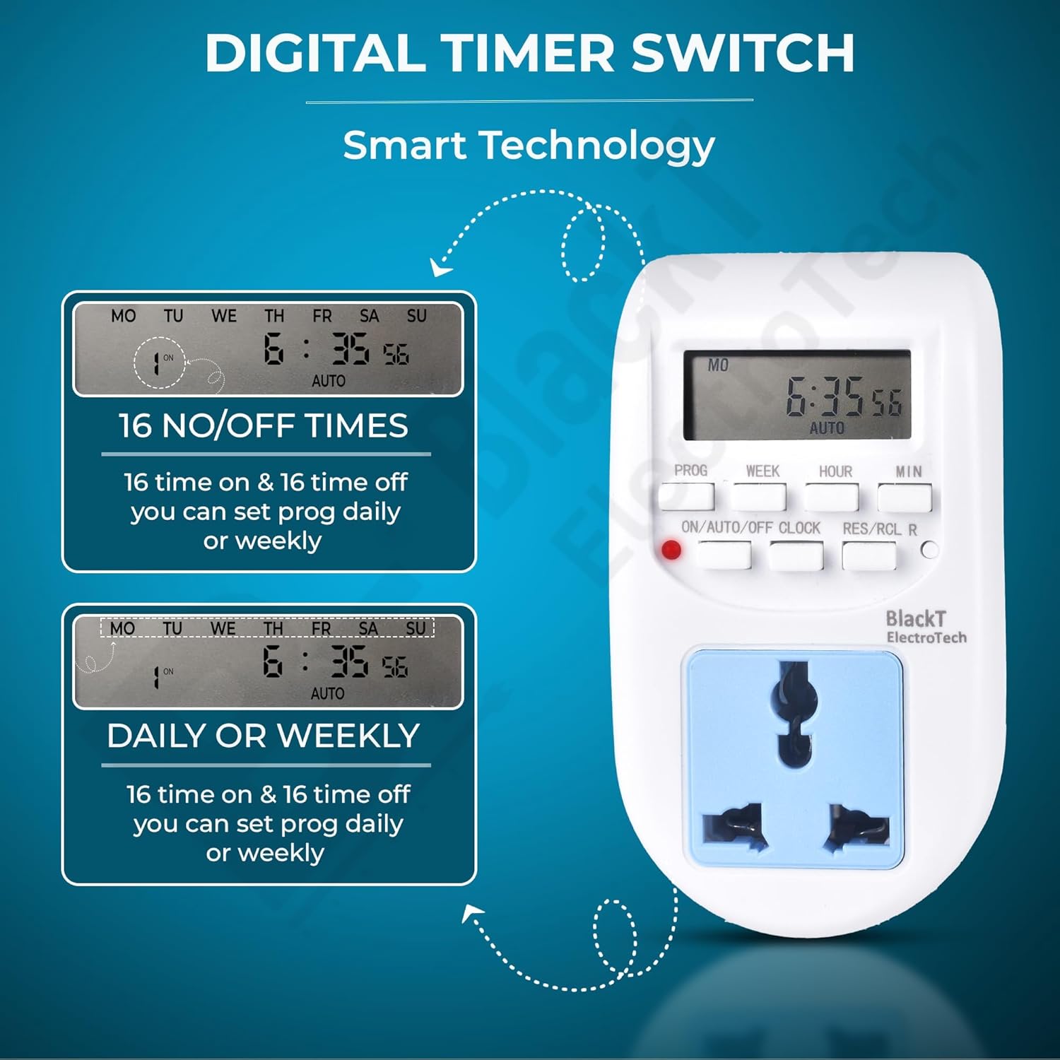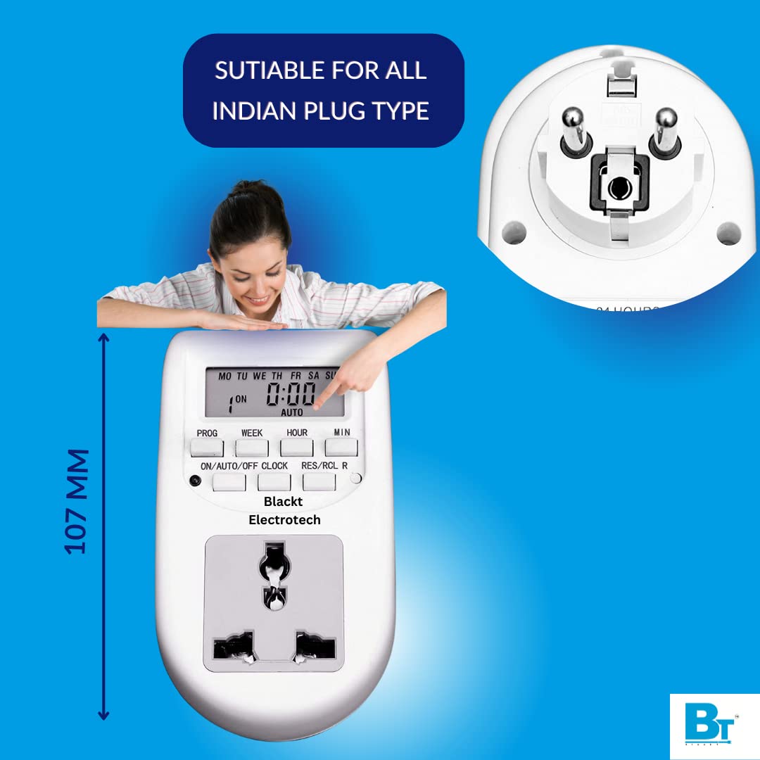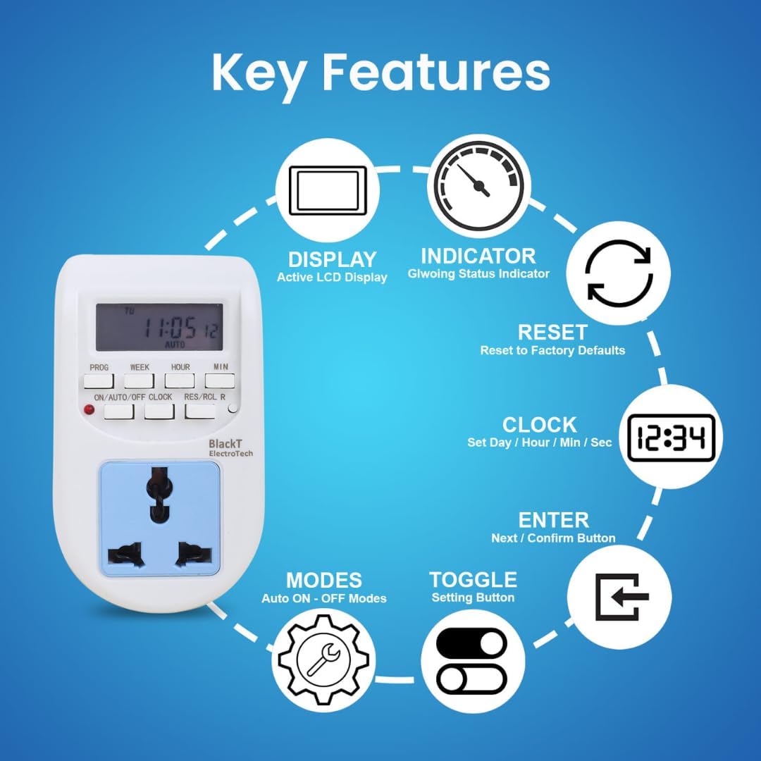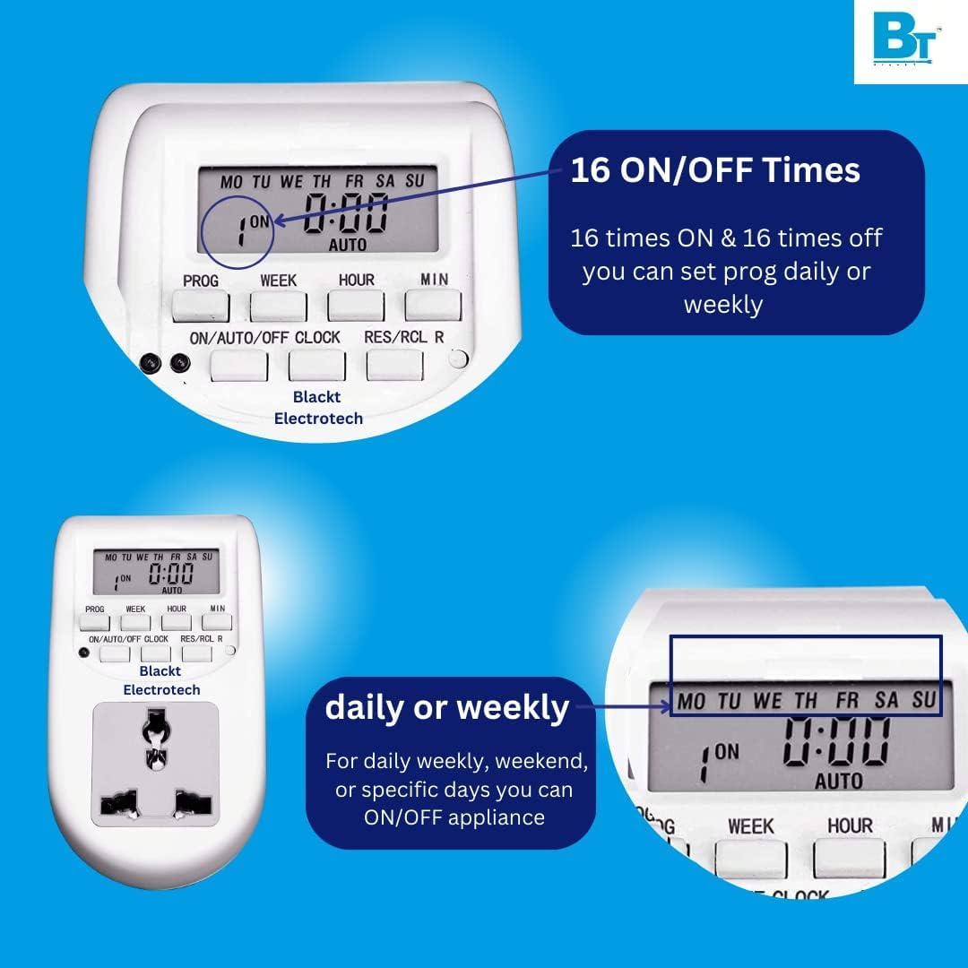 Be the first to review “Blackt Electrotech BT41P 230V 10A Digital Programmable Timer Socket Plug – 24×7 Electronic Outlet for Automated Lights, Energy Saving & Home Appliances”