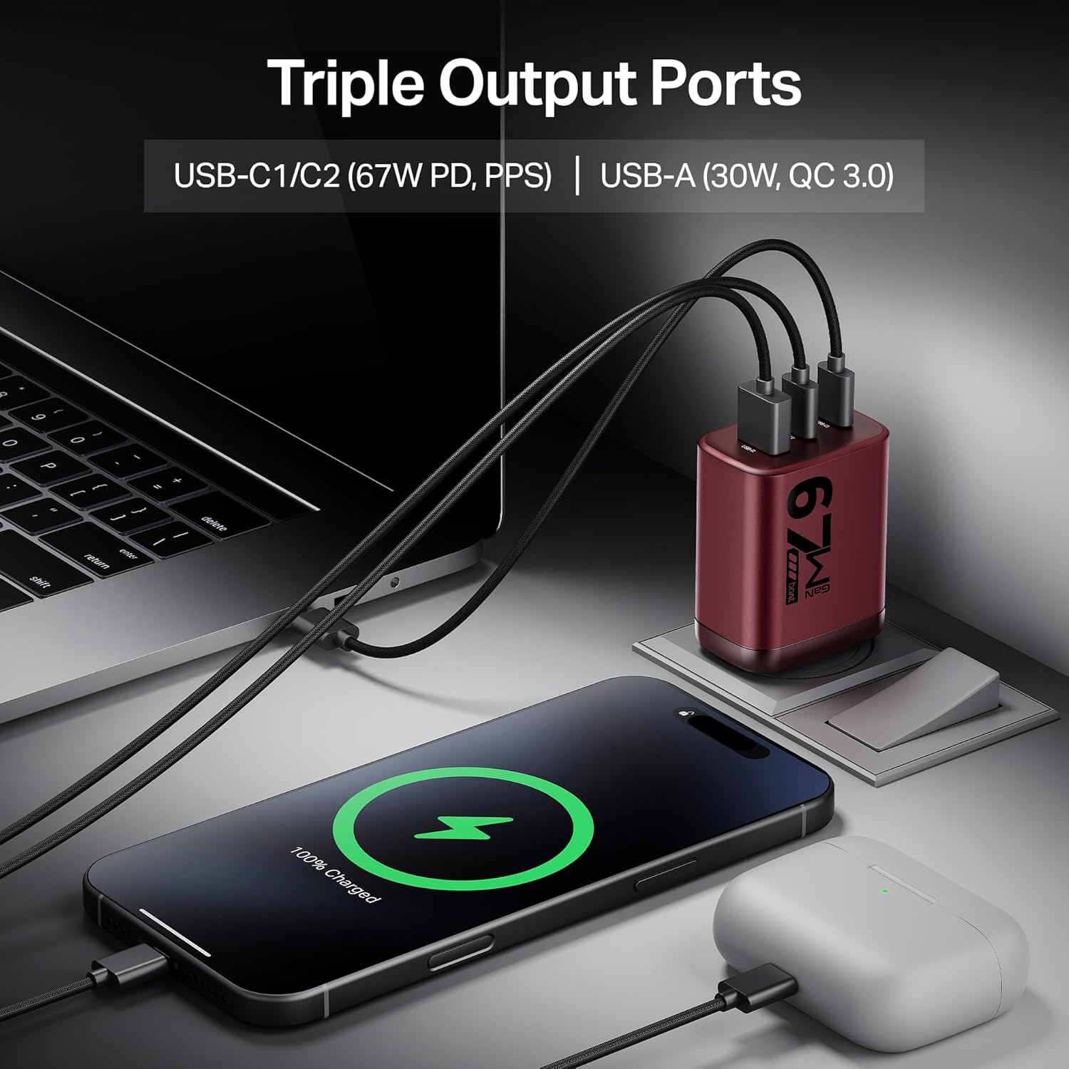 3 Output Ports & Auto-Detect Technology: Need to charge multiple devices? With USB-A (30W QC 3.0) and dual Type-C ports (67W PD, PPS), this charger delivers 45W + 7.5W + 7.5W (Max) across 3 smart output ports.