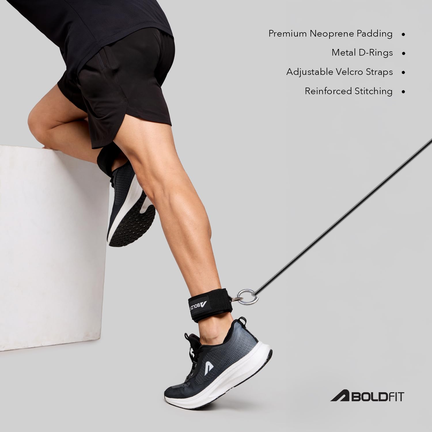 DURABLE & EASY TO CARRY: Built to withstand rigorous daily use, Boldfit Ankle Straps are made with heavy-duty stainless steel D-rings and reinforced stitching for enhanced durability. They are designed to last through countless intense workout sessions without losing their integrity. Lightweight and compact, they easily fit into any gym bag, allowing you to carry them wherever you go. Perfect for gym-goers who want reliable, portable fitness gear for lower body strengthening.