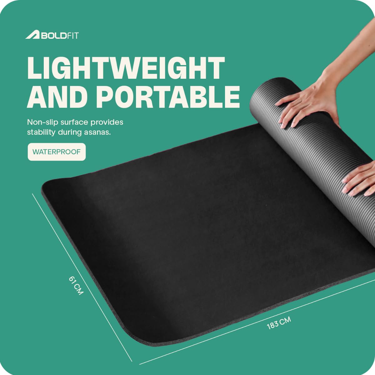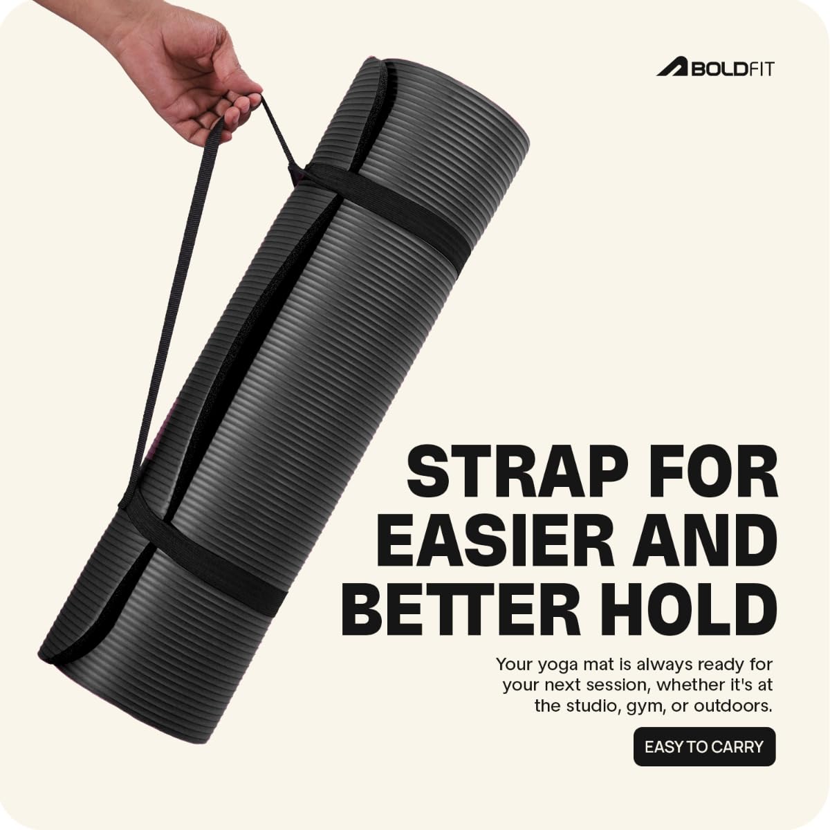YOGA MAT WITH STRAP – A yoga mat strip is included with our Boldfit NBR all-purpose premium workout mat , Easy strapping and light weight feature are added to this mat for easy transport and storage. Carry around your yoga mat & flaunt it with ease!