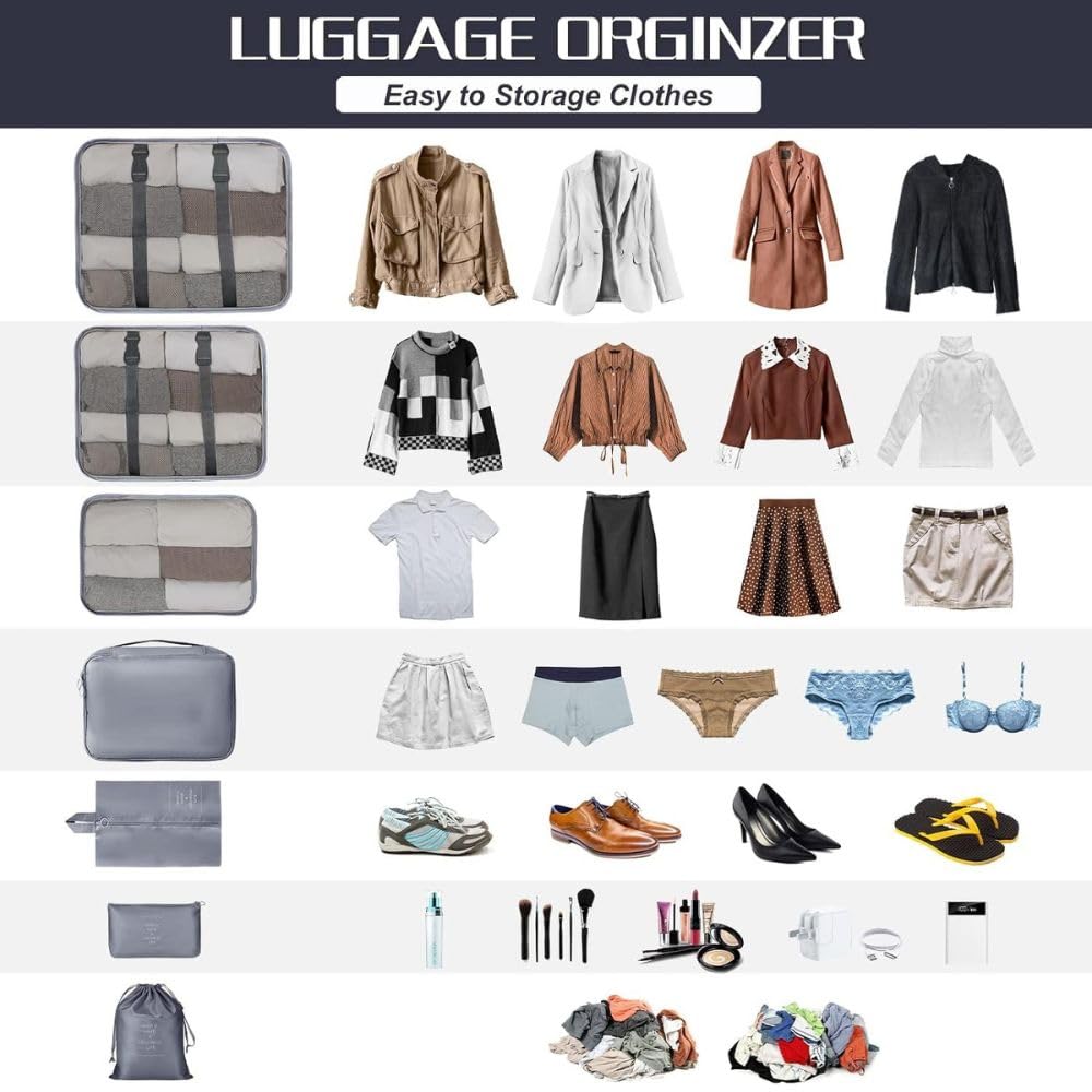 Clearly Organized Packing: Each cube is designed for specific items – large cube for shirts, smaller ones for lighter clothes, a bag for underwear and socks, and pouches for toiletries and makeup. The shoe bag even fits one pair of slippers and sneakers.