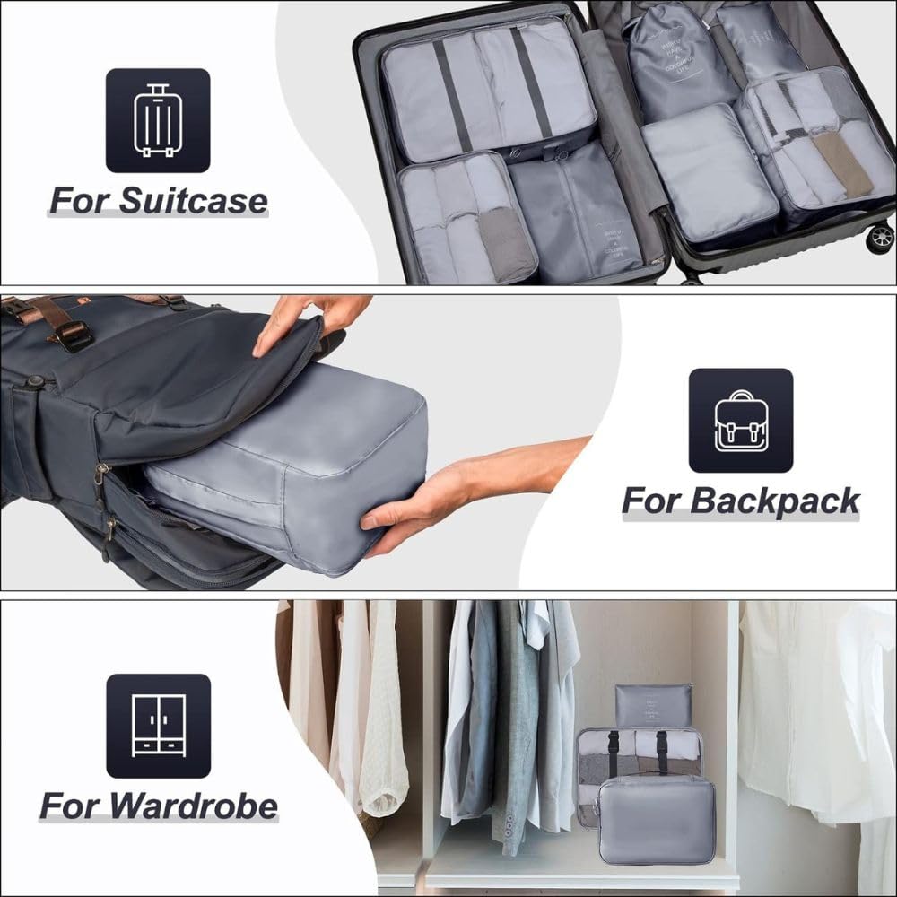 Stay organized on the go with this 7-in-1 Travel Packing Cubes Set – your all-in-one solution for neat and efficient packing. Ideal for vacations, business trips, and weekend getaways. Key Features: Complete Set – Includes 3 packing cubes, 1 underwear bag, 1 toiletry bag, 1 cosmetic pouch, and 1 shoe bag Space-Saving – Maximize suitcase space and keep clothes wrinkle-free Durable & Lightweight – Made from high-quality tear-resistant waterproof nylon Multi-Functional – Perfect for organizing clothes, shoes, underwear, toiletries, and makeup Fits Most Luggage – Compatible with suitcases, carry-ons, backpacks, and duffle bags Travel-Friendly Design – Easy to pack, unpack, and identify items with smooth zippers and mesh panels Make packing stress-free and stylish with this must-have travel organizer kit!