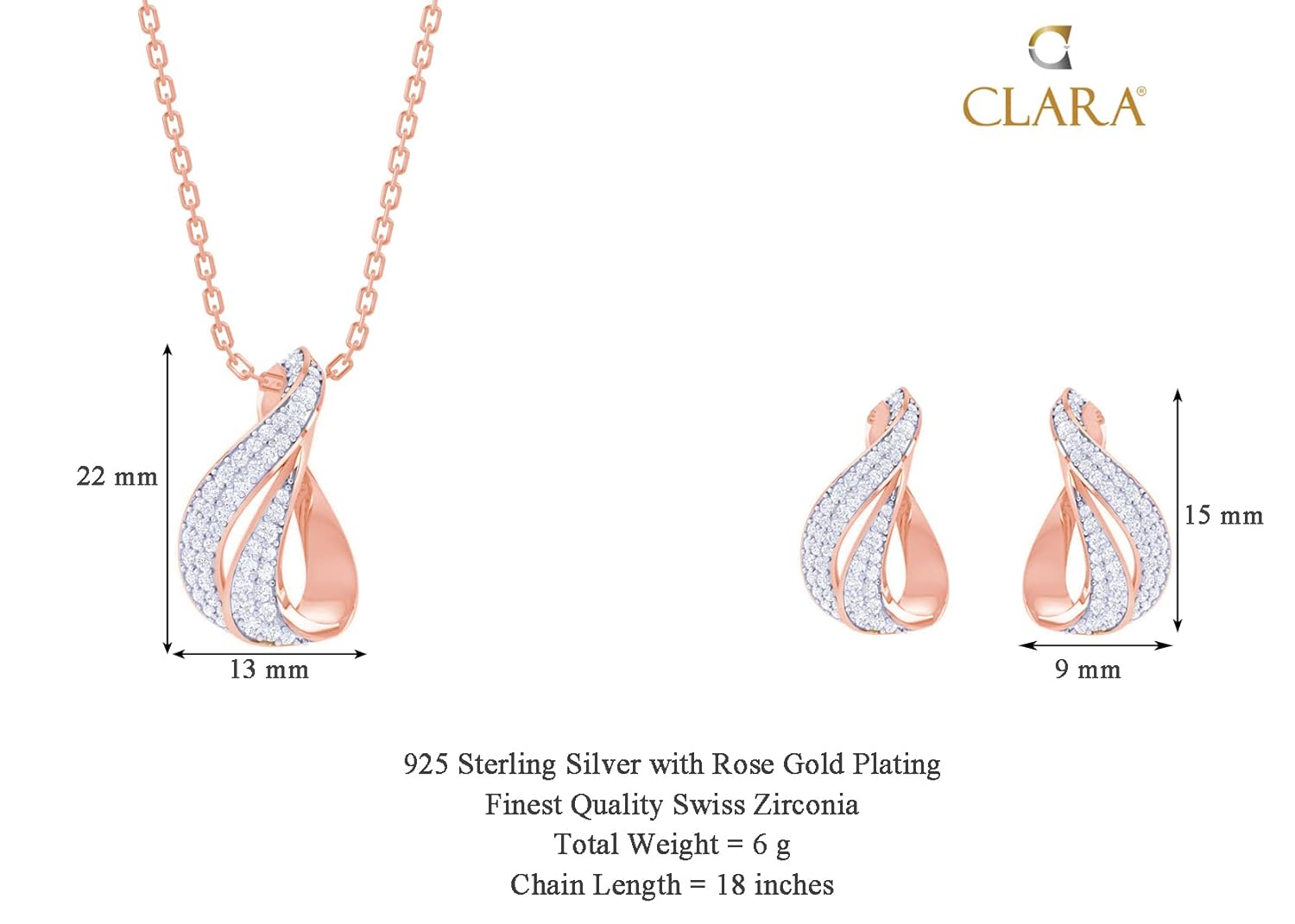 Made in Pure 92.5 % Real Sterling Silver. 925 stamp will be on every product. 18″ Long 92.5 % Pure Sterling Silver Link Chain will be provided with this Pendant earring set. Swiss Zirconia – As brilliant As Diamond is used. Sparkle of our specially cut zirconia is very much equivalent to Real Diamond and even professionals can not differentiate with naked eyes whether it is Zirconia or Diamond. 2 Microns Thick Rose Gold Plating is done to give beautiful Rose Gold look. Product comes in a very elegant gift box with CLARA Authenticity Card. Earrings comes with Screw Back for comfortable wear and real looks.