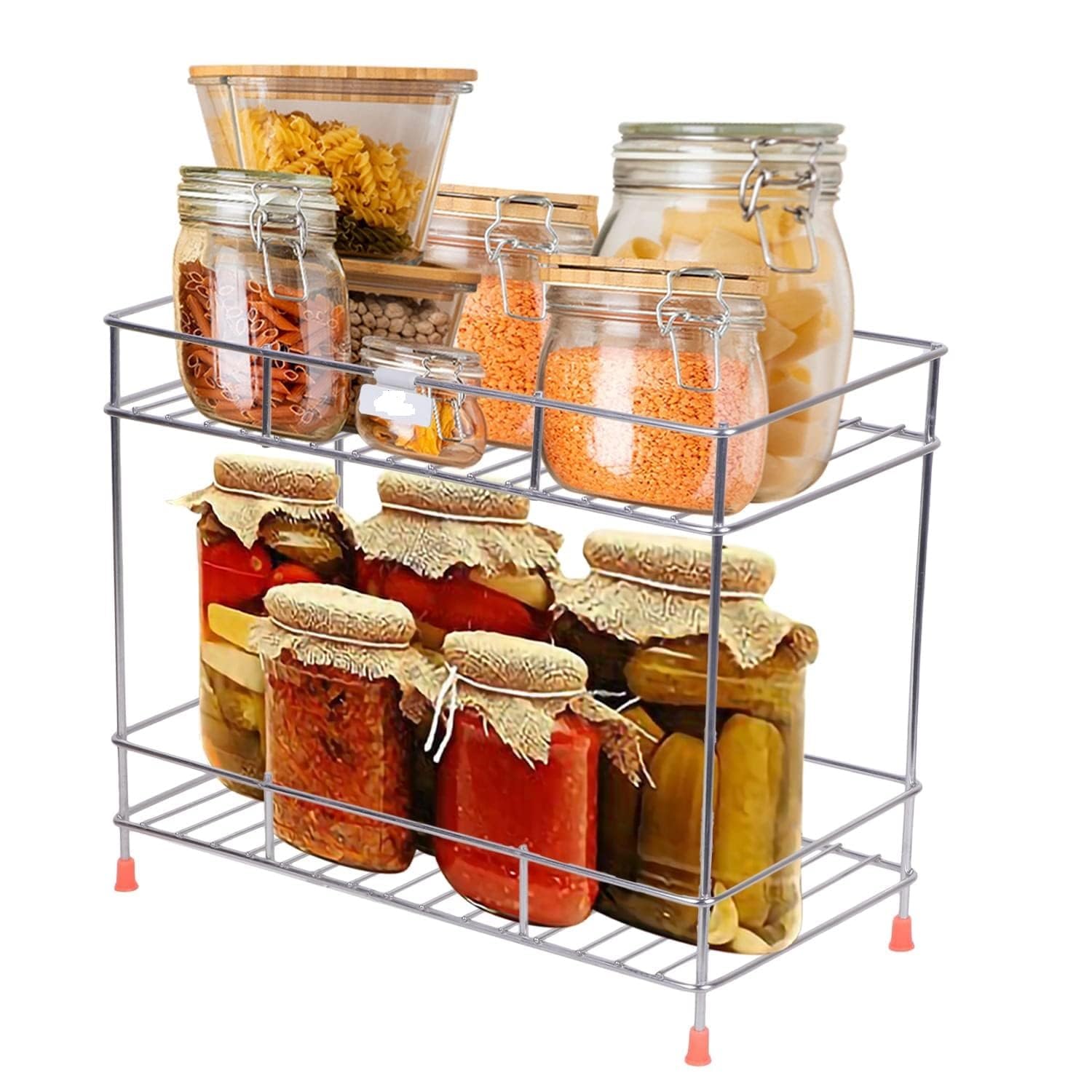 :-STRONG AND DURABLE: Solid steel spice jar kitchen racks come with a hardwearing anti-rust coating. The stands have double support rods to provide each shelf with extra stability.