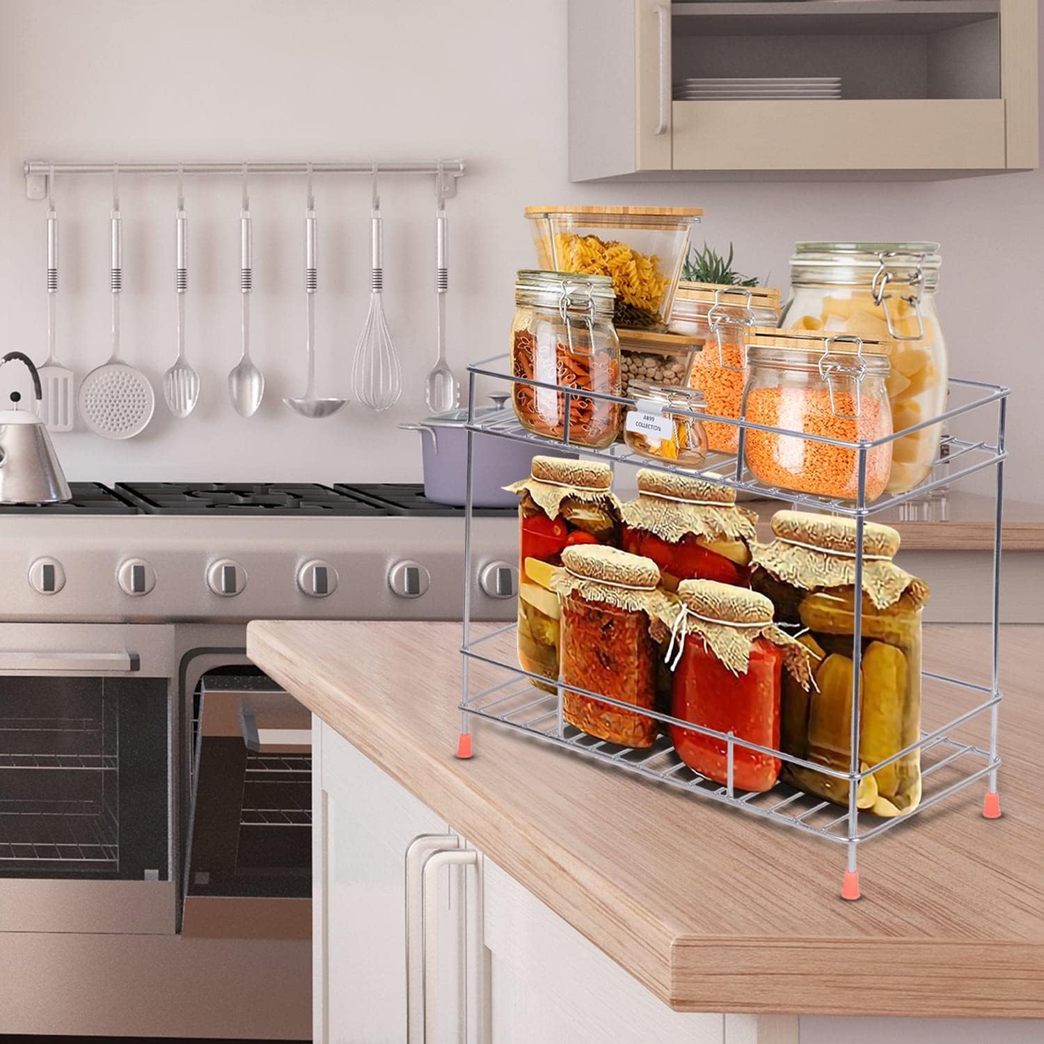:-2 STURDY LEVELS: The kitchen shelf holder insert can hold numerous items on 2 sturdy levels. Keep your bowls, plates, or food neatly organized in your kitchen.