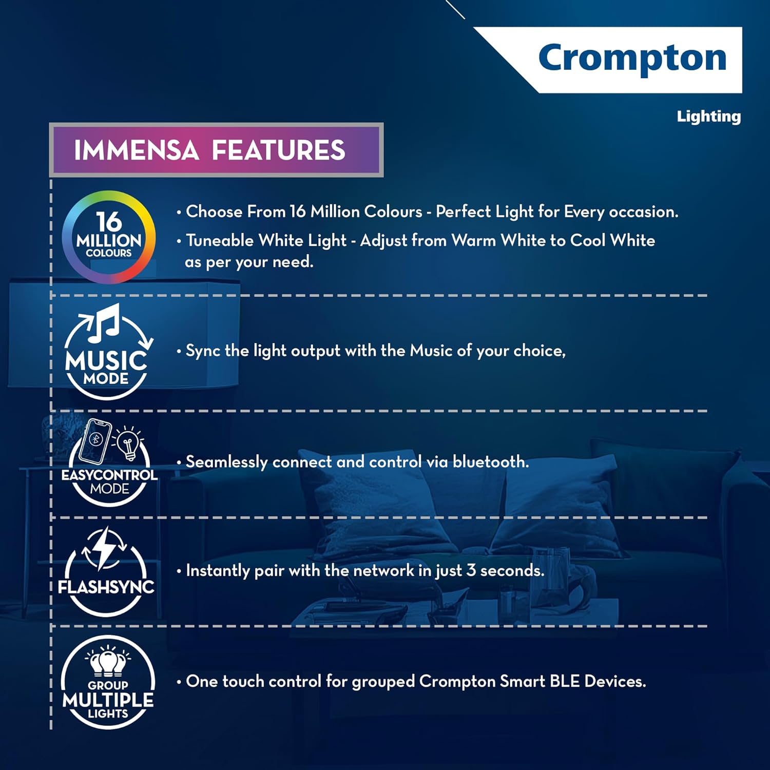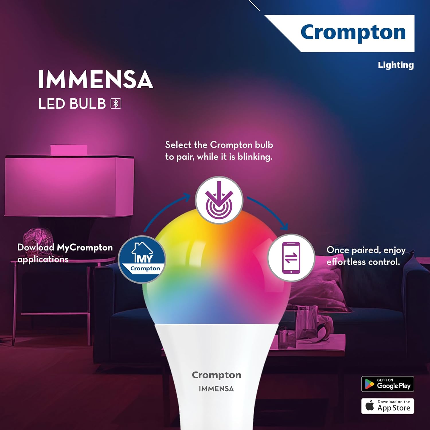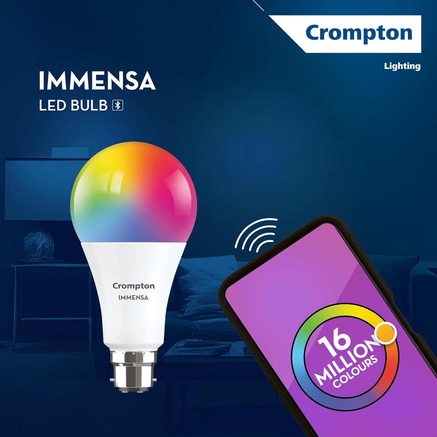 Be the first to review “Crompton Immensa 9W Bluetooth Enabled Smart Bulb B22 | 16 million Colours | White Tunable (Warm, Neutral & Cool White) & Dimmable | App-Control |Music Sync|Perfect light for all occasions|Pack of 1”