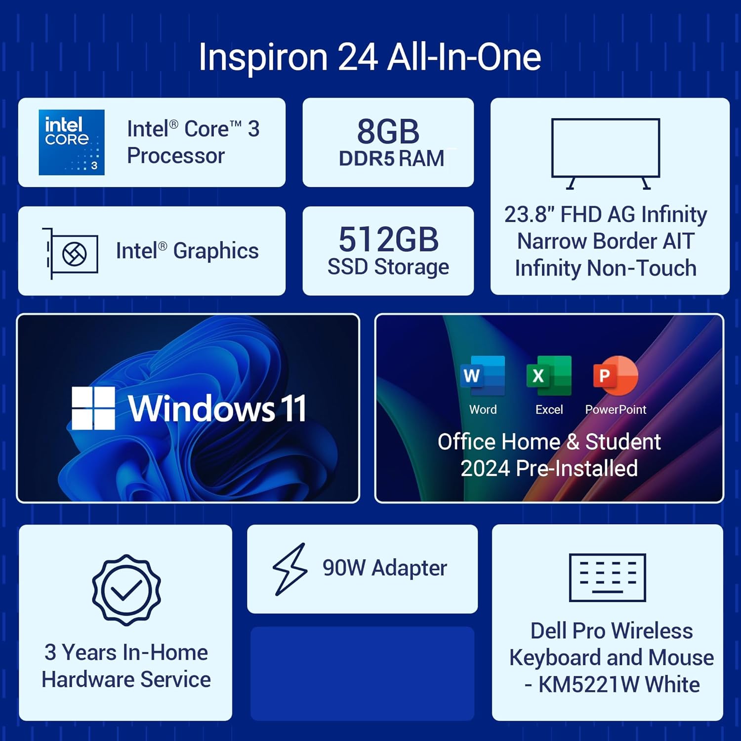 Core 3 100U | 8GB DDR5 | 512GB SSD | Win 11 + Office H&S 2024 | Intel® Graphics | 23.8″ FHD AG Narrow Border AIT Infinity NT Display | Dell Pro Keyboard and Mouse – KM5221W – US English – White | 3 Years Onsite Hardware Service| Pearl White Cover + Molded Speaker Grill
