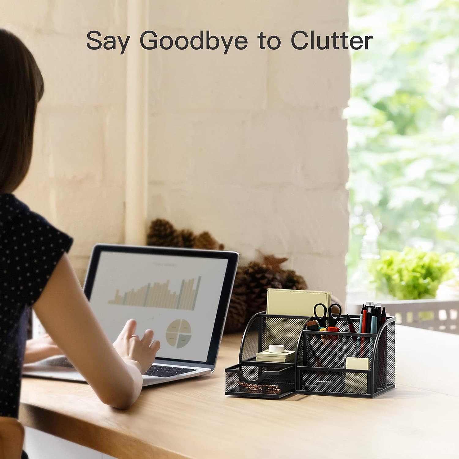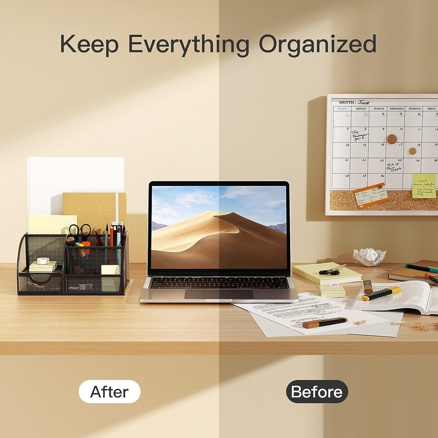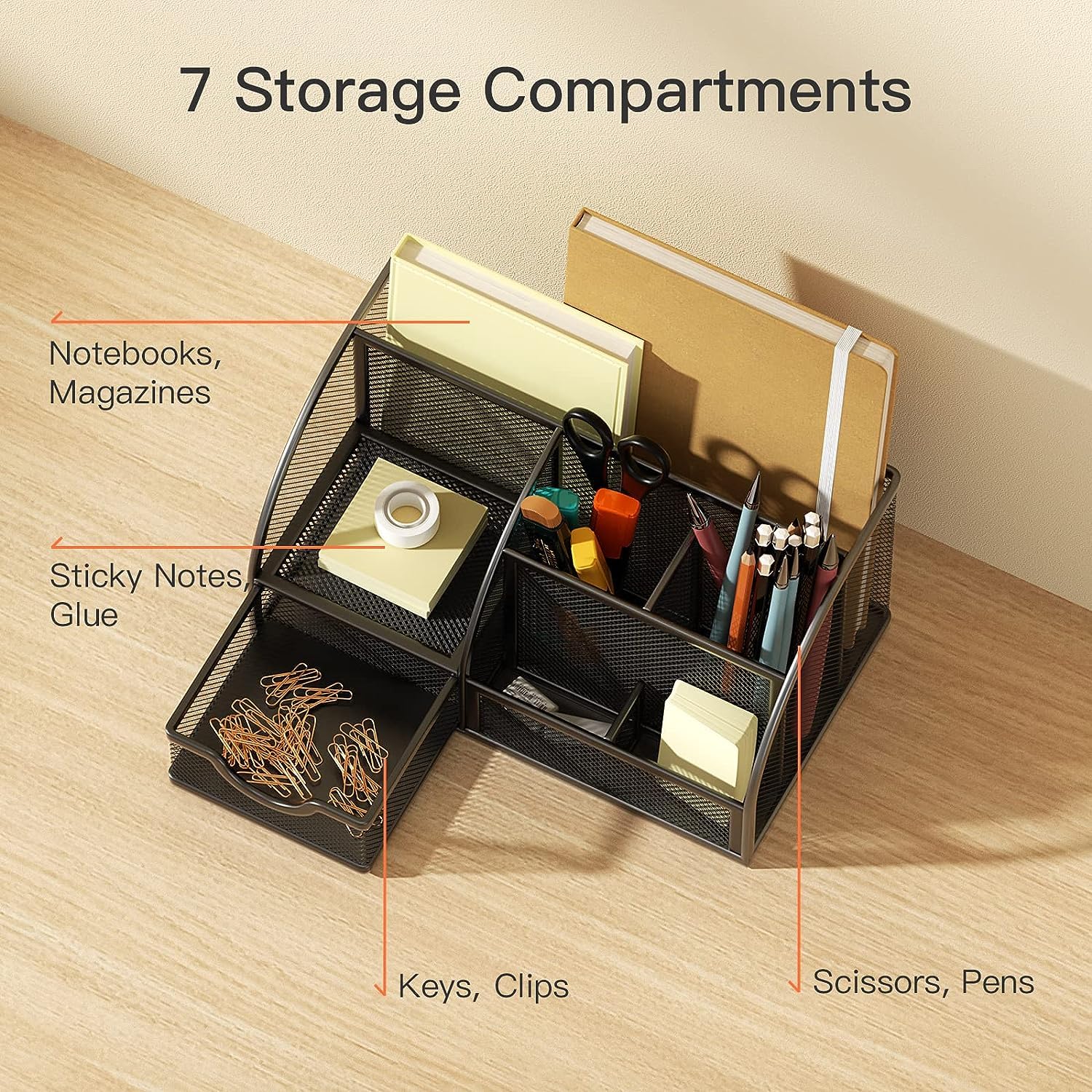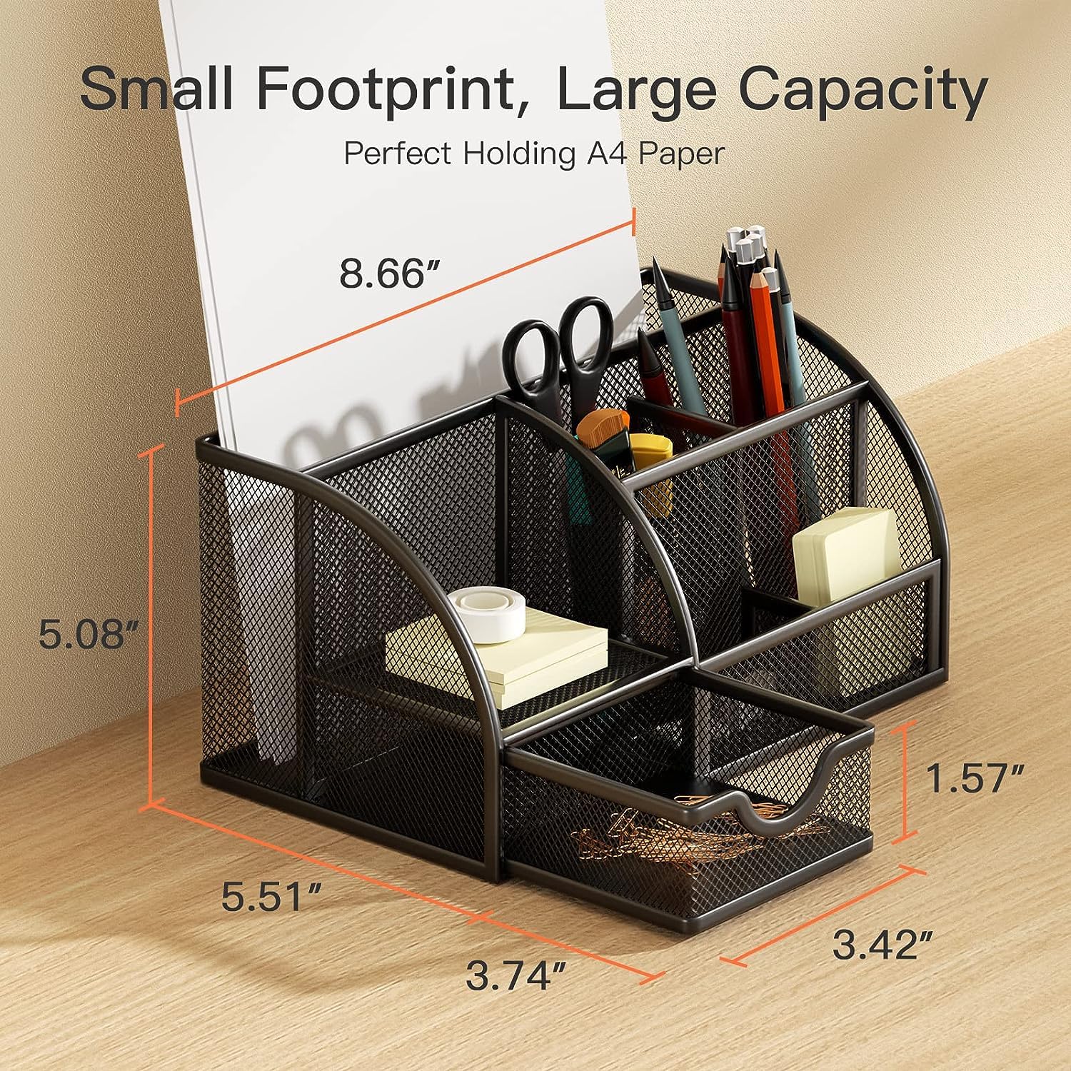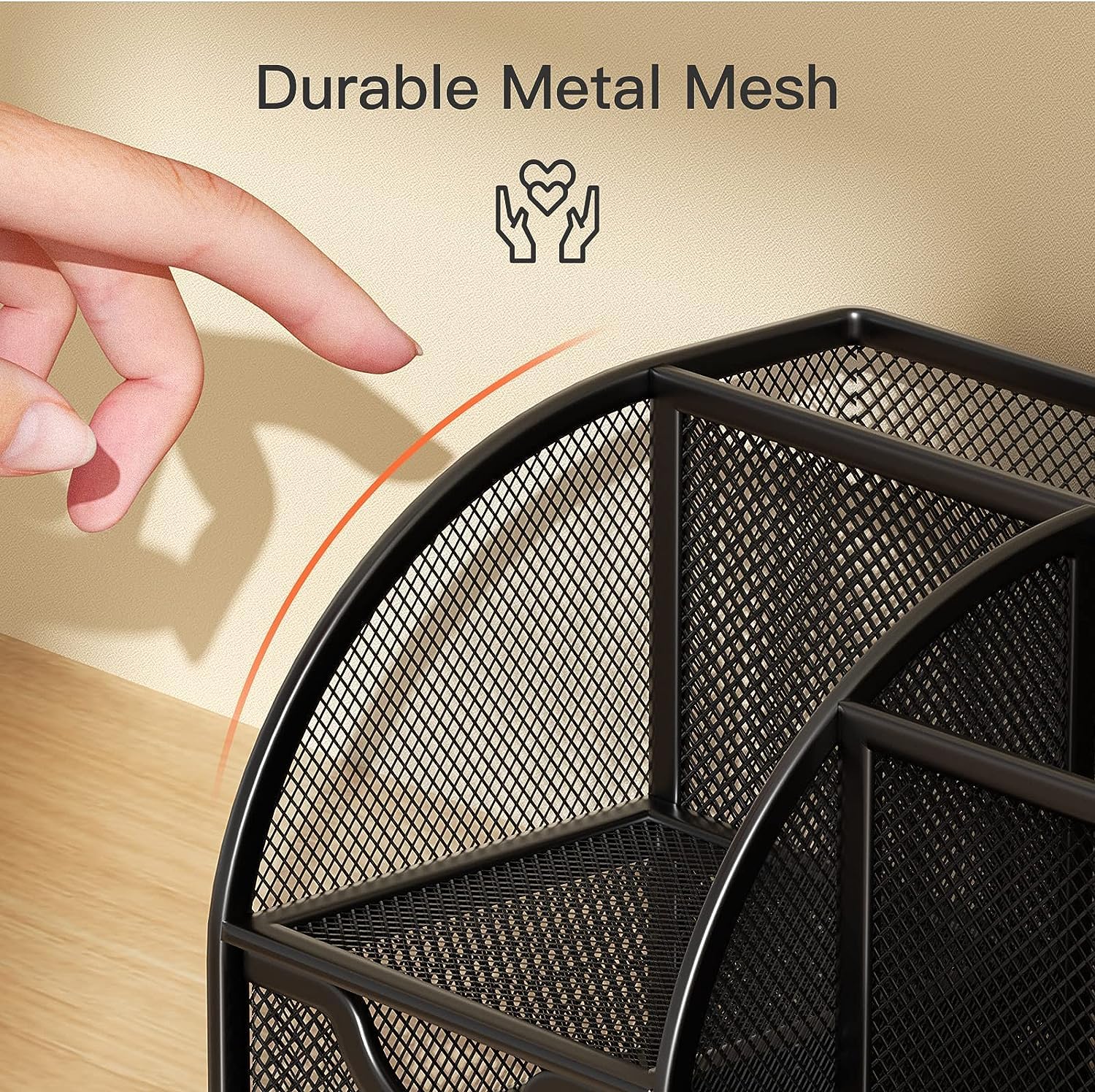 【PREMIUM METAL MESH MATERIAL】: — Made of sturdy metal, let this mesh desk organizer showcase its own durable, sturdy and smart-looking feature which can last for a long-time use. Keep the stuff you need at hand, while staying out of your way.
