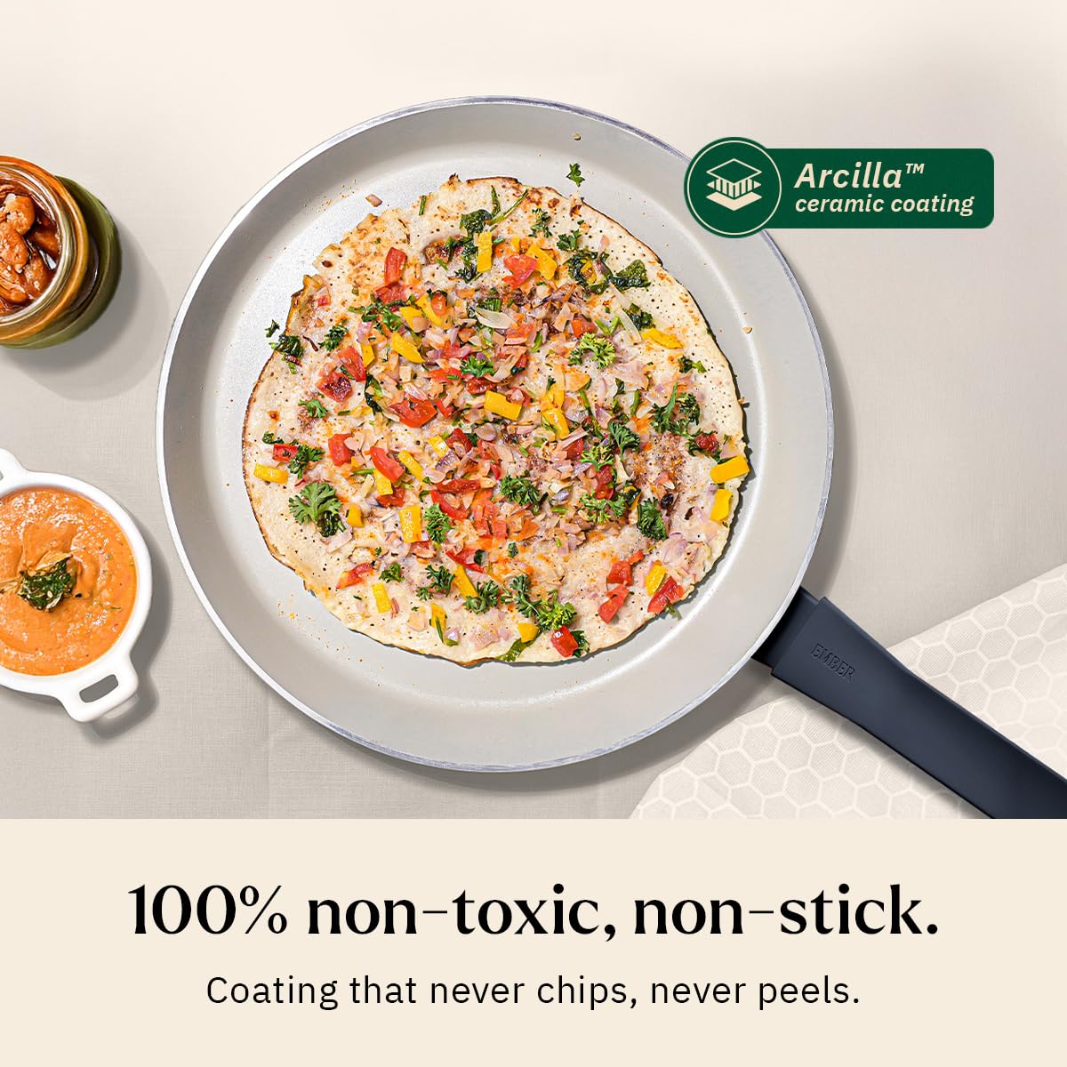 What you should know: That silver edge you see in Tawa? It’s just the 3mm food‑grade aluminium core peeking through. It isn’t a cooking surface, and most cooking won’t involve pouring from the rim, but we believe you should know it’s there.