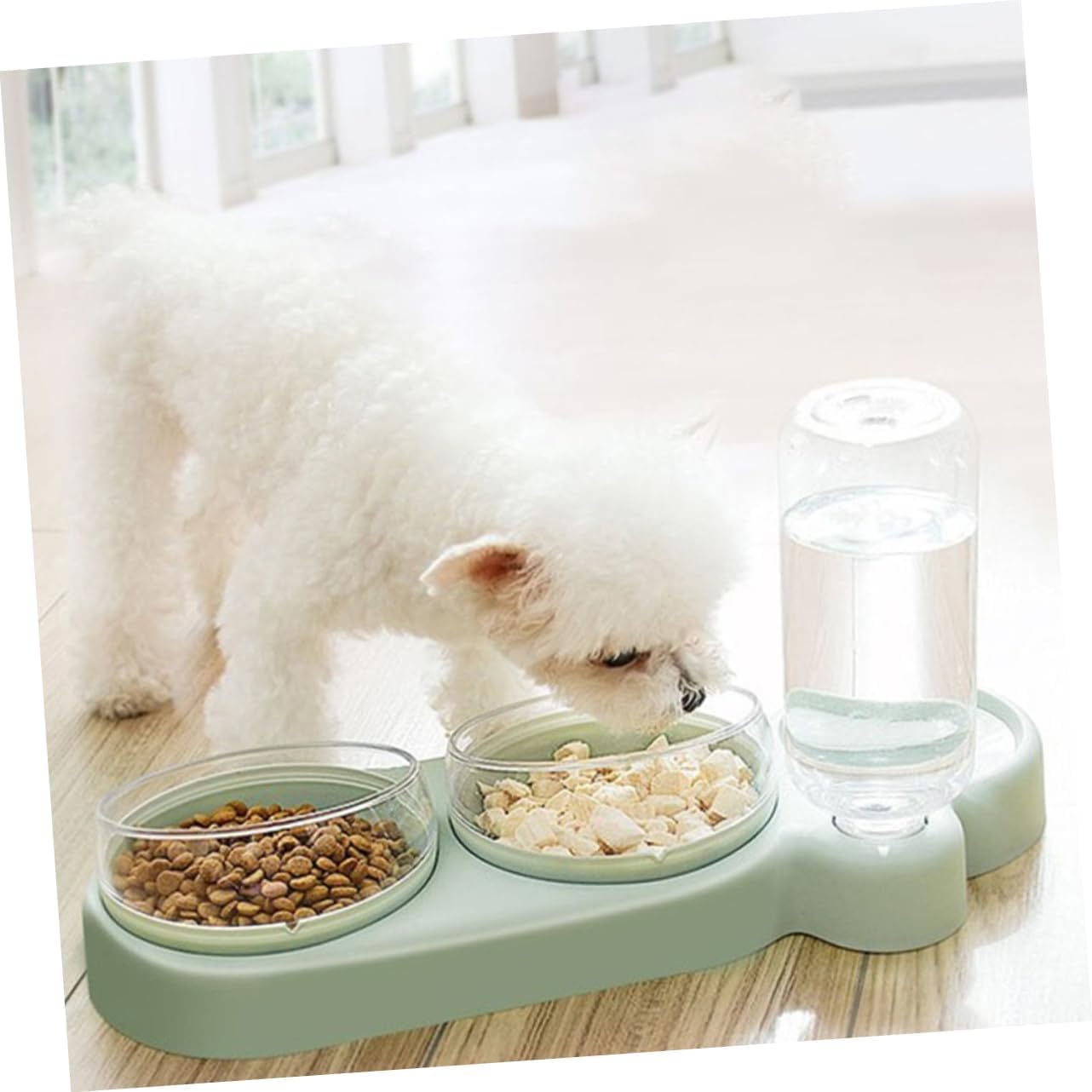 Full Set Design: Pet water and food bowl set, can be filled with water, dry food, snacks, fully meet the needs of pet feeding, suitable for multi pet family.Automatic Waterer Bottle: Pet bowl set with a water dispenser bottle, gravity discharge structure, automatic water storage, full but not overflowing.