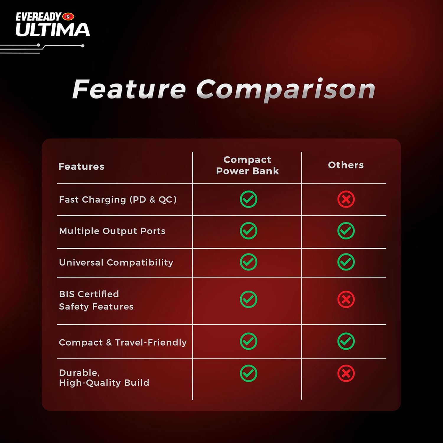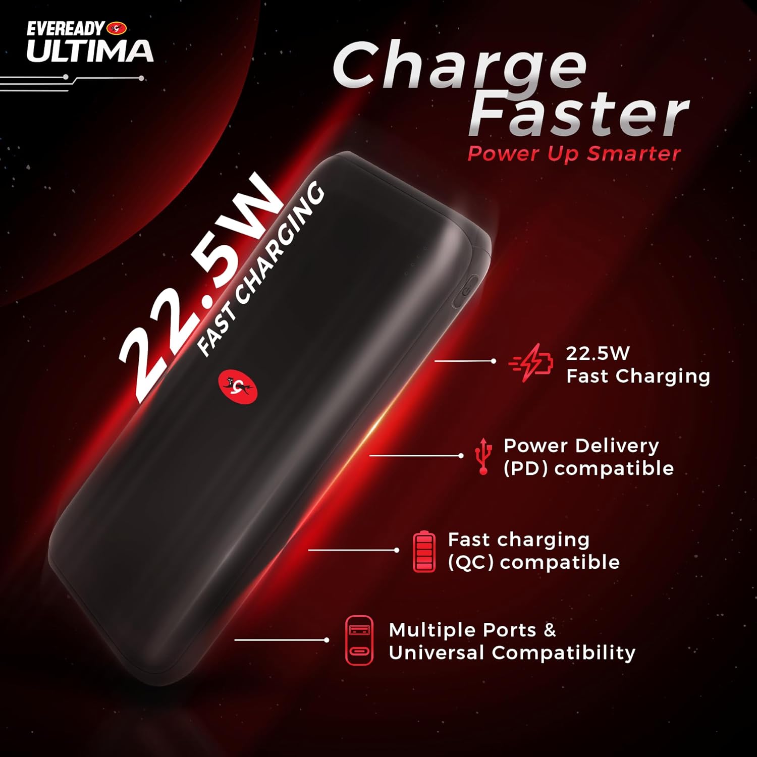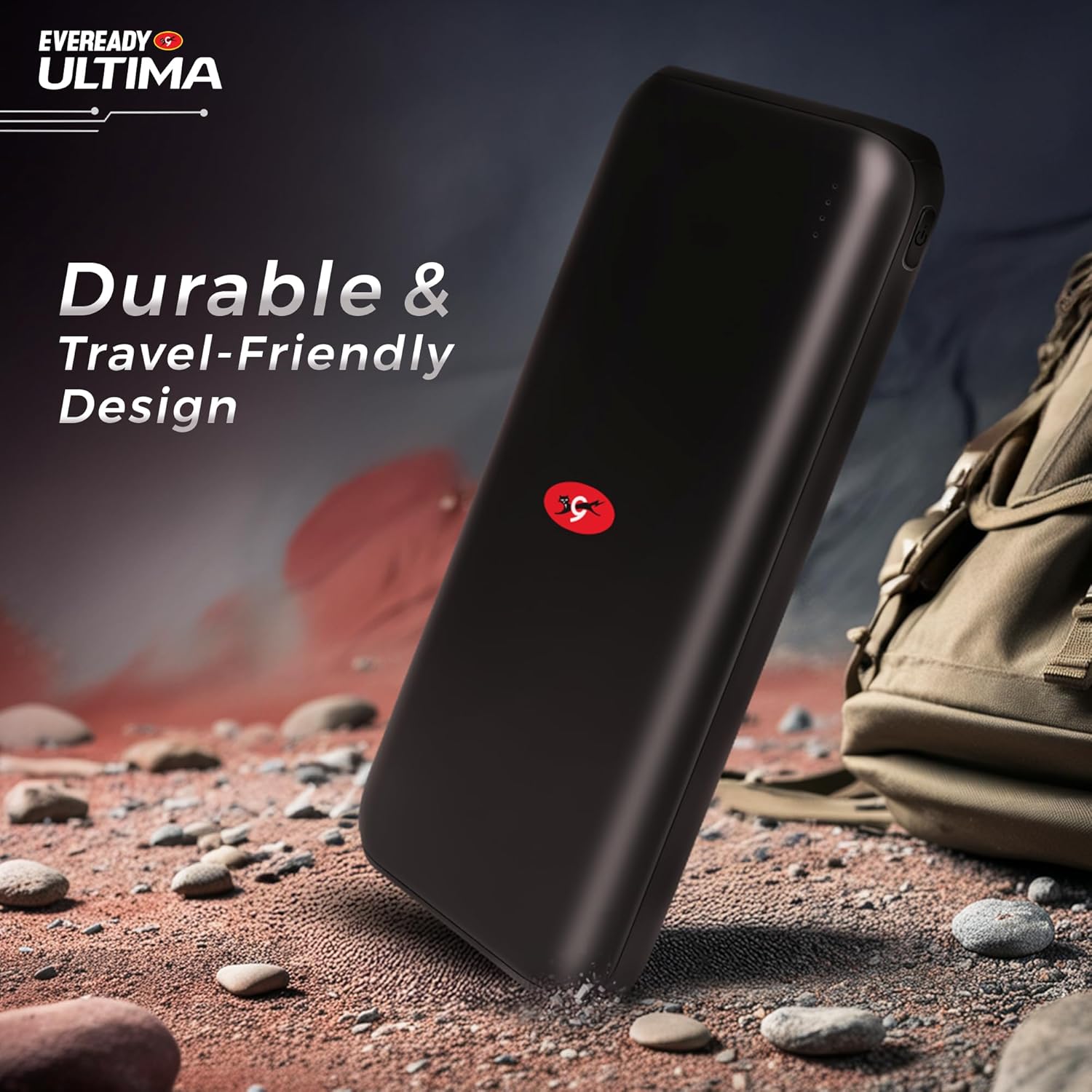 COMPACT, LIGHTWEIGHT & TRAVEL-FRIENDLY: Designed for portability, the Eveready Ultima power bank features a sleek, durable body that easily fits into pockets, bags, or hands, making it the perfect choice for those who are always on the move.