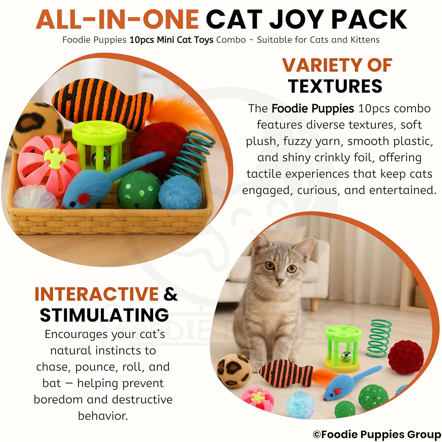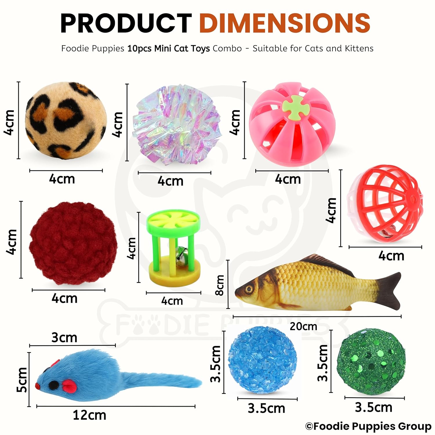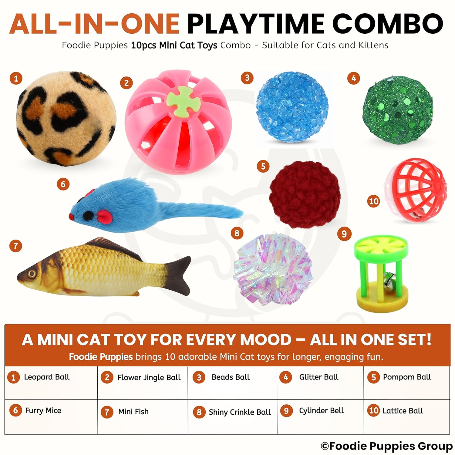 10-in-1 Combo Set: A complete play pack featuring a variety of toys, including a plush mouse, mini fish, crinkle foil ball, and jingling balls to keep your cat entertained all day.