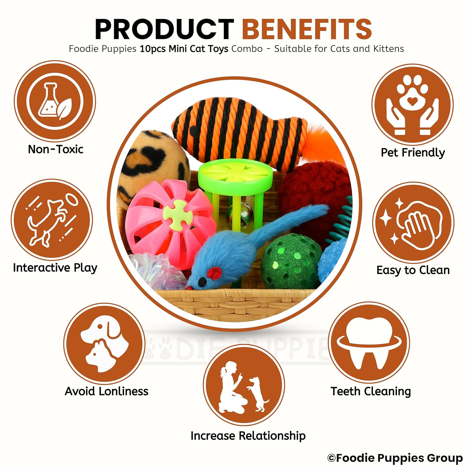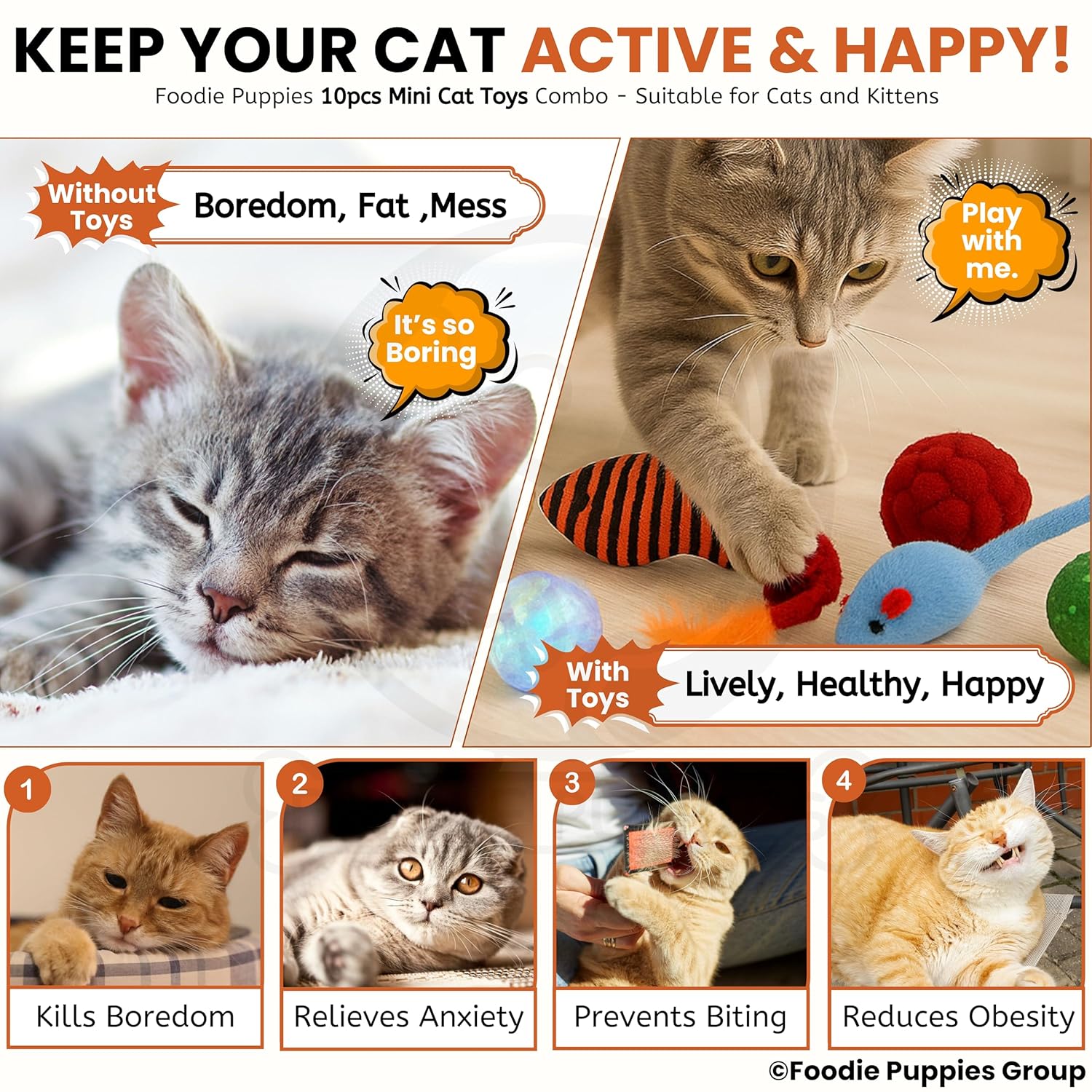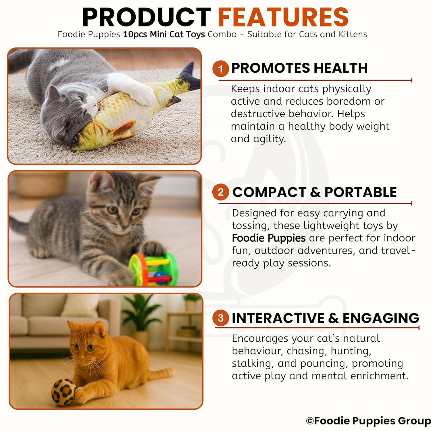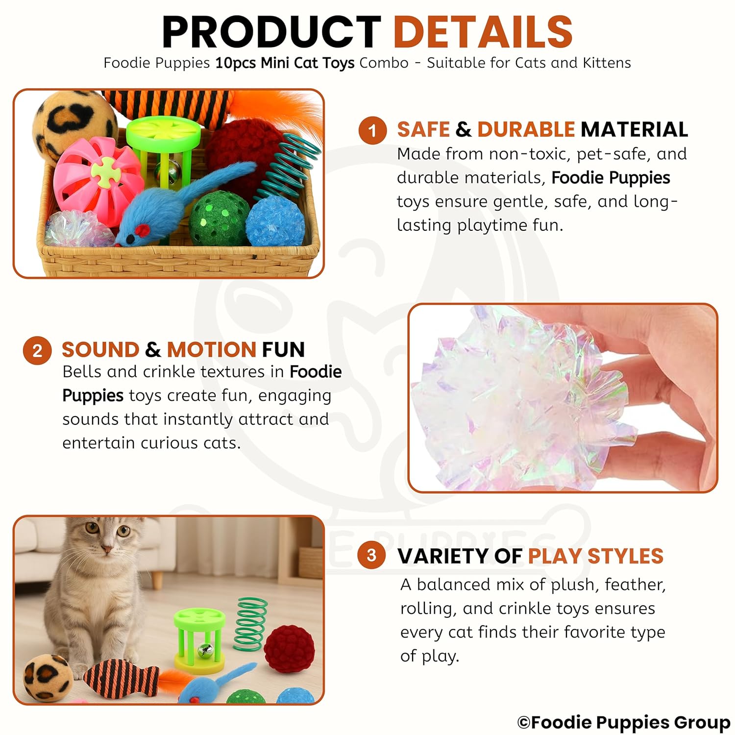 10-in-1 Combo Set: A complete play pack featuring a variety of toys, including a plush mouse, mini fish, crinkle foil ball, and jingling balls to keep your cat entertained all day.