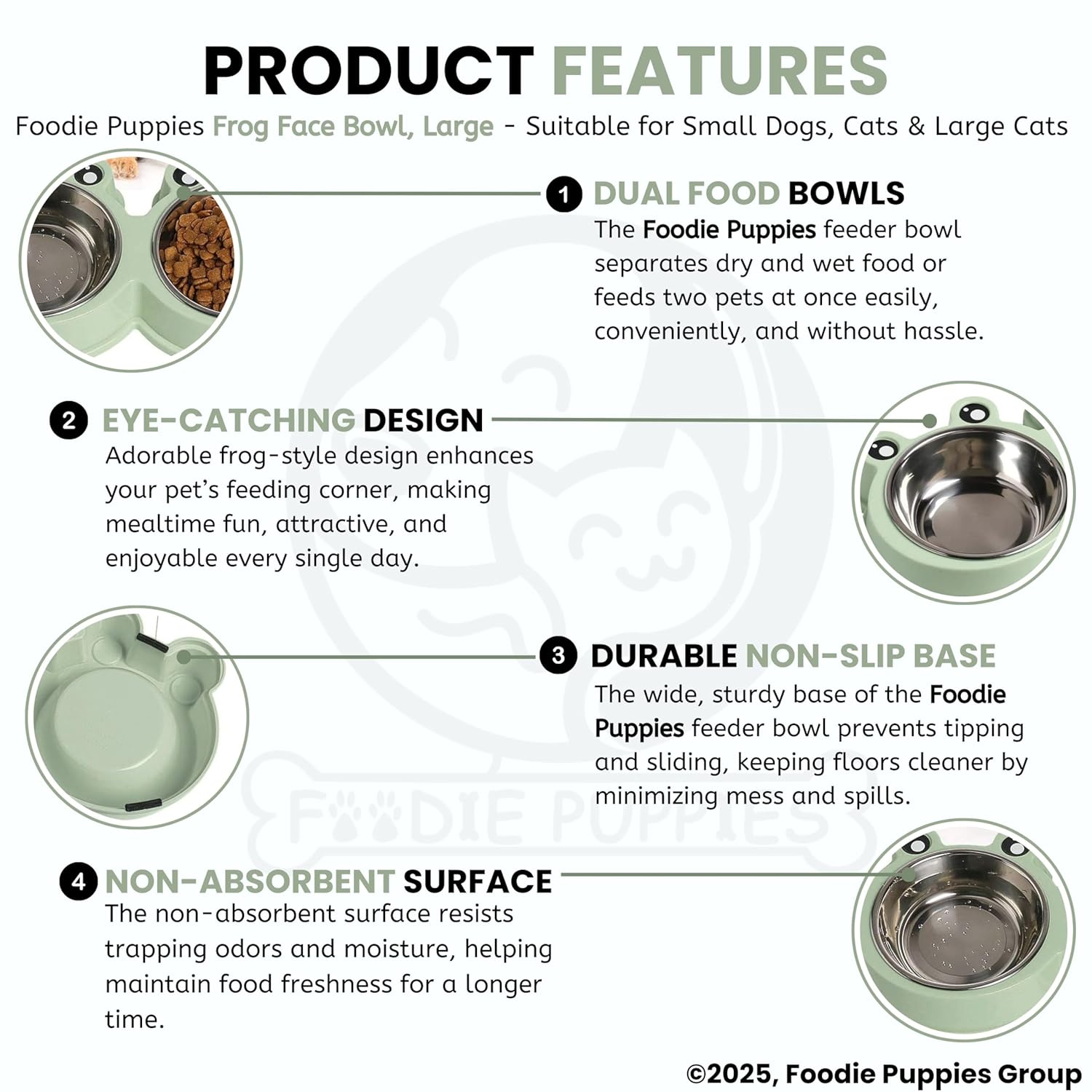 Foodie Puppies Double dog bowl is designed as a fog shape to attract your dog/cat to eat, raise their appetite for food, and make your feeding work more satisfying. The stainless steel bowls are removable, so it’s easy to take them out to wash and keep clean, what’s more, it’s also convenient to add food or water elegant & practical design and make it much fun for the dog or cat while eating. Treat your furry friend to the best dining experience with our Double Bowl Cat Feeder. Its elevated design, durable construction, and functional features make it a must-have accessory for every cat owner. Invest in your cat’s well-being and happiness by adding this feeder to your cart today! Suitable for your little pet like your Chihuahua/Bulldog/little cat/rabbit all kinds of small pets. This Dual Stainless Steel Bowl is able to make your little pet eat and drink with dual bowls set, also you can have two eating or drinking in one of these products. Our double-bowl cat feeder is thoughtfully designed with an elevated platform, which promotes better posture while eating. By lifting the bowls to a comfortable height, it reduces strain on your cat’s neck and joints, making mealtime a more enjoyable and pain-free experience. The feeder’s base is equipped with non-slip pads to keep it securely in place, preventing unnecessary spills and messes during your cat’s mealtime. This feature ensures stability and minimizes the chances of your cat tipping the bowls over while eating.