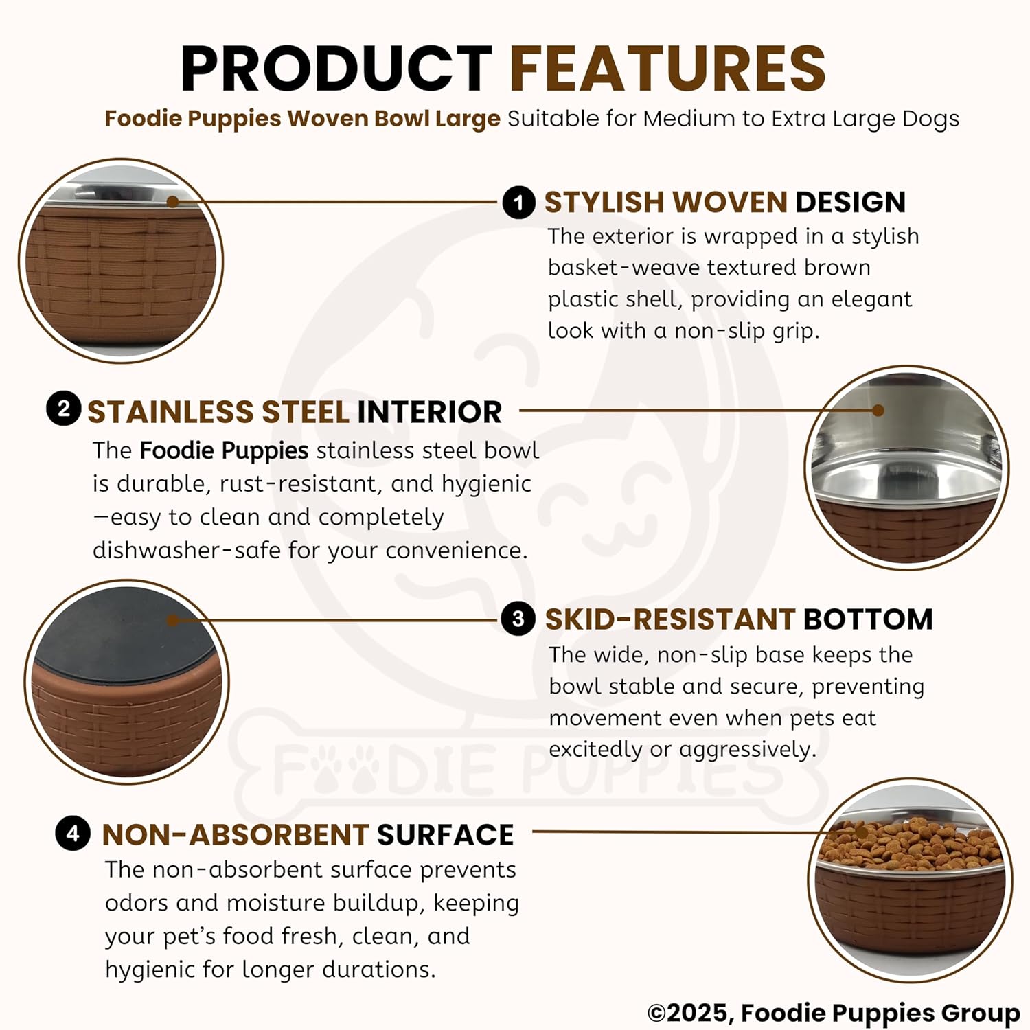 【Woven Mat Design】Woven mat pattern on the outer layer will prevent the bowl from getting scratched by your pet’s claw. Polished interior resists sticking and cleans up quickly.