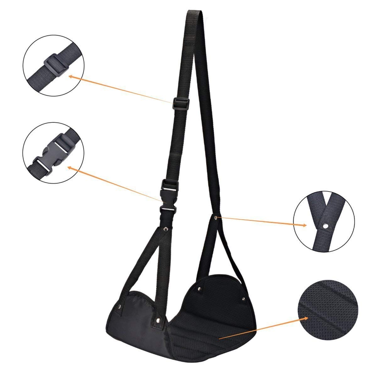 Simply hang it on the arms of the tray table and place your feet in footrest. Enjoy it with the tray table up or down. The reinforced straps are easy, allowing you to find the ideal length. Perfect for shorter legs.