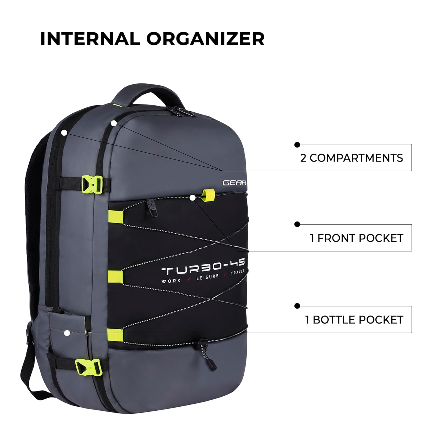 Gear Turbo 45L Expandable Water Resistant Anti-Theft 4 Compartment Backpack/Laptop Bag/Briefcase For Men/Women With Raincover (Grey)