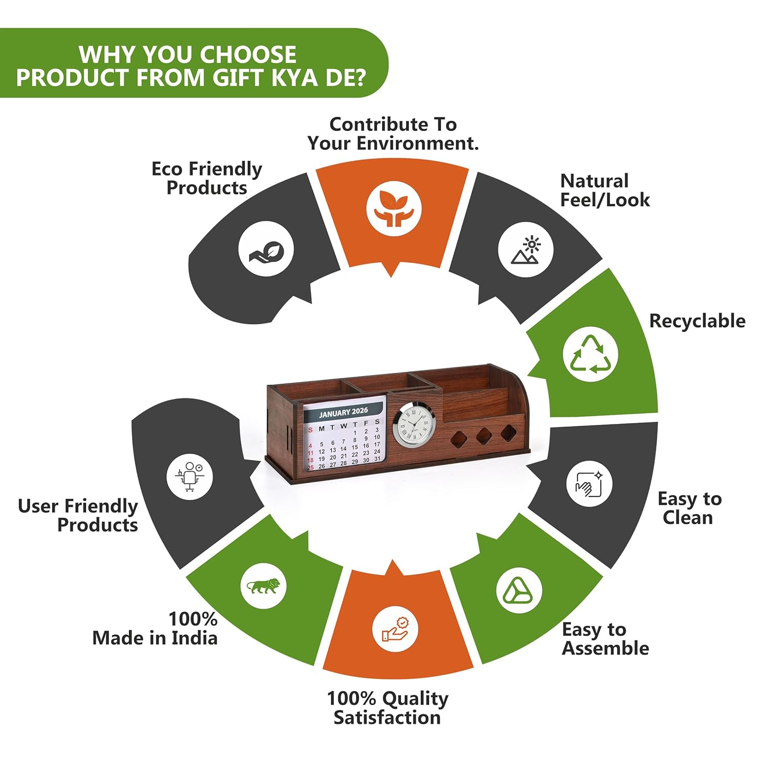 Premium wooden desk organizer with elegant finishBuilt-in 2026 calendar & clock for daily convenience4 compartments to neatly store desk essentialsKeeps workspace clean, organized, and productiveIdeal for office, study table, and home useStylish & practical gift option for professionals