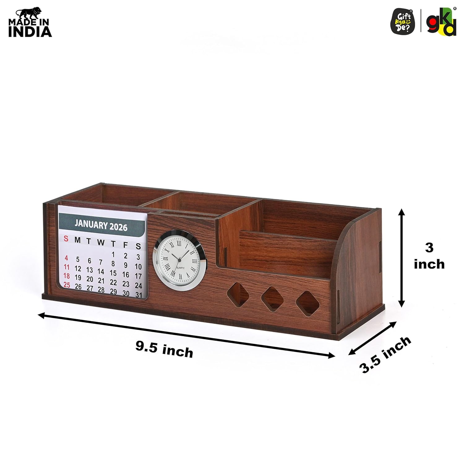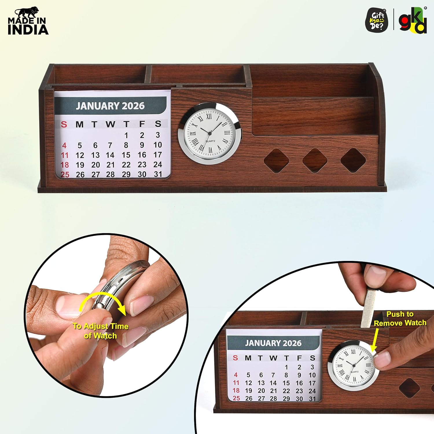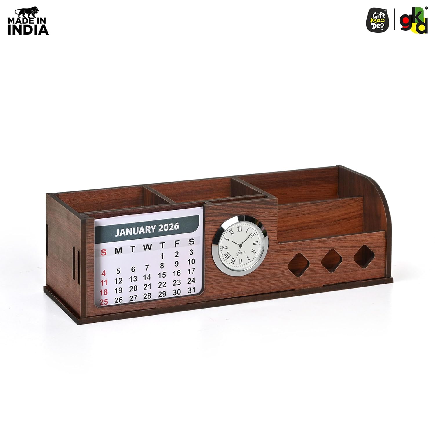 GKD Wooden Desk Calendar 2026 with Clock & Desk Organizer | Premium Engineered Wood Table Calendar for Office & Home Decor | Corporate Gift | Made in India