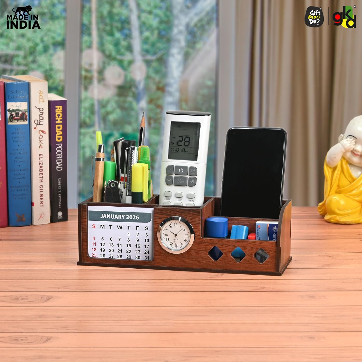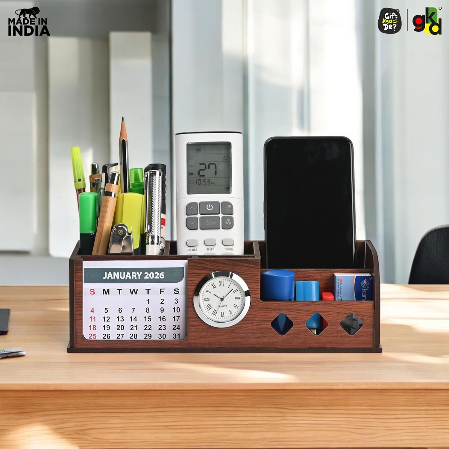 All-in-One Desk Organizer: Designed with multiple compartments to store pens, stationery, mobile phone, remote control, visiting cards, Clock & Calendar 2026.