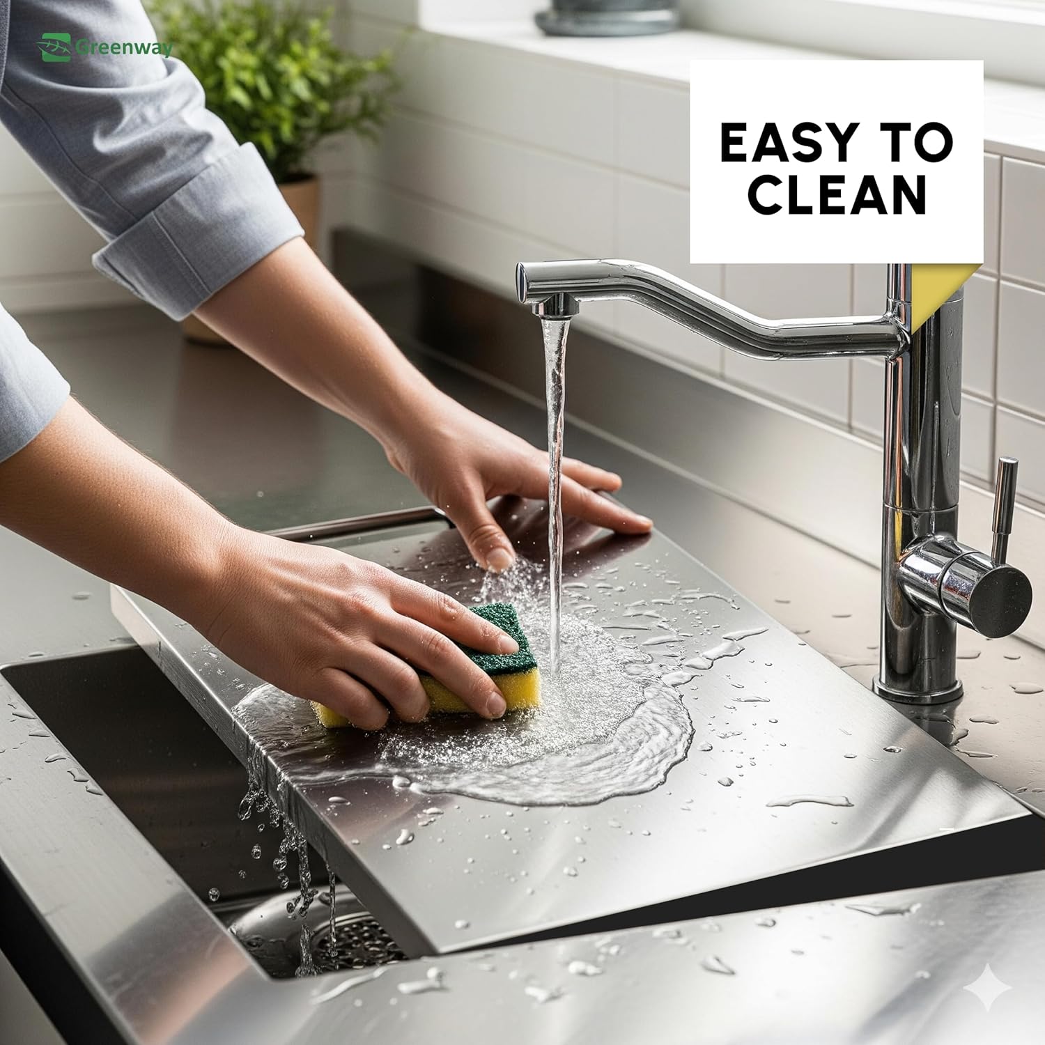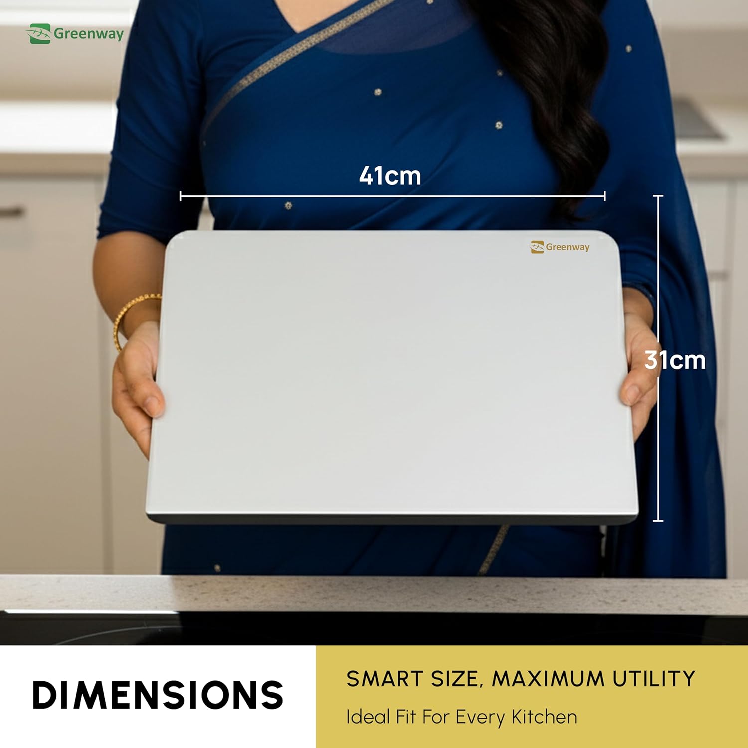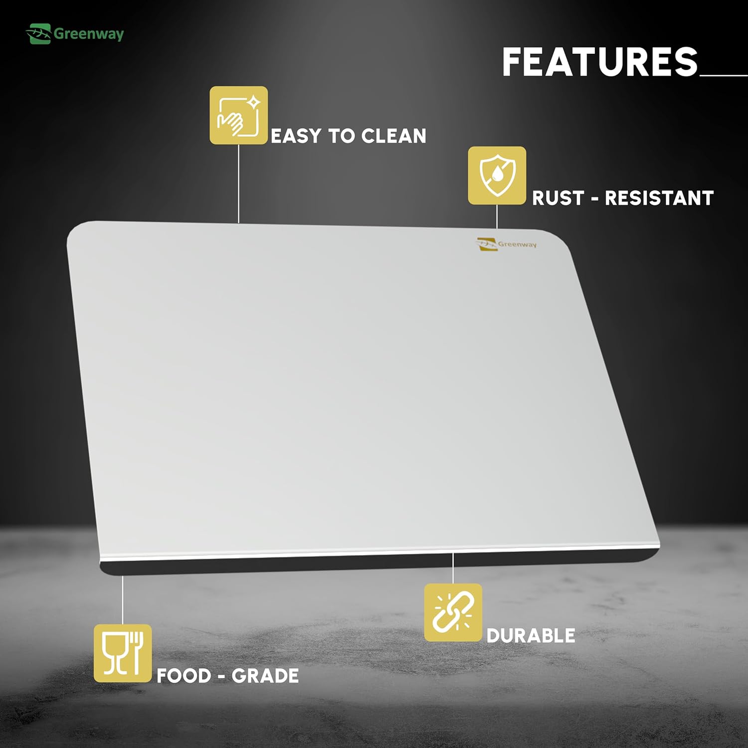 Upgrade your kitchen with the Greenway Stainless Steel Chopping Board with Kitchen Lip, designed for durability, hygiene, and convenience. Crafted from premium food-grade stainless steel, this cutting board provides a safe and hygienic surface for all your food preparation needs. Unlike traditional wooden or plastic boards that absorb moisture and develop stains, this stainless steel cutting board is rust-resistant, non-porous, and easy to clean, ensuring long-lasting performance and absolute safety in every use. The large 41 x 31 cm surface offers ample space for chopping vegetables, slicing fruits, cutting meat, poultry, and fish, or even kneading dough. The innovative kitchen lip design ensures the board stays securely in place on your countertop, preventing slips and enhancing safety during use. Its non-slip base adds extra stability, allowing you to chop and cut with confidence. Perfectly engineered for heavy-duty usage, this chopping board is resistant to scratches, cracks, and stains, making it far more durable than bamboo, wooden, or plastic alternatives. Whether you are a professional chef or a home cook, this stainless steel cutting board delivers reliable performance day after day. Cleaning is hassle-free – simply rinse under running water or wipe with a damp cloth, and it’s as good as new. The smooth metal surface prevents bacterial growth, offering a hygienic solution for modern kitchens. Its sleek, minimalist design also adds a stylish touch to your cooking space. Ideal for cutting, slicing, dicing, mincing, kneading, or serving, this versatile cutting board is a must-have kitchen essential. With its eco-friendly, reusable, and highly durable design, the Greenway Stainless Steel Chopping Board is built to last for years, ensuring value and safety for your family. Choose Greenway for a smarter, safer, and more hygienic cooking experience.