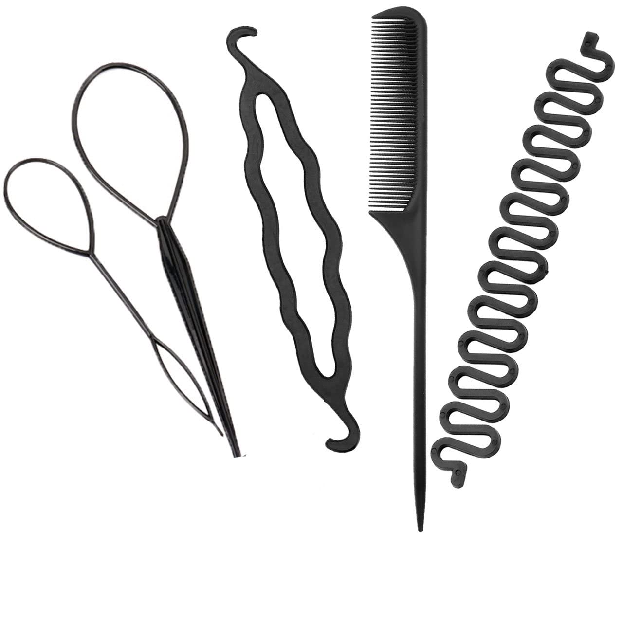 Combs, hair coils, hair pulling pins hair accessories all in one, is the perfect hair styling magic tool Package include: 2*topsy tail kit,2*bun maker,1*french braid tool, 1*hair comb (total 6 pieces)