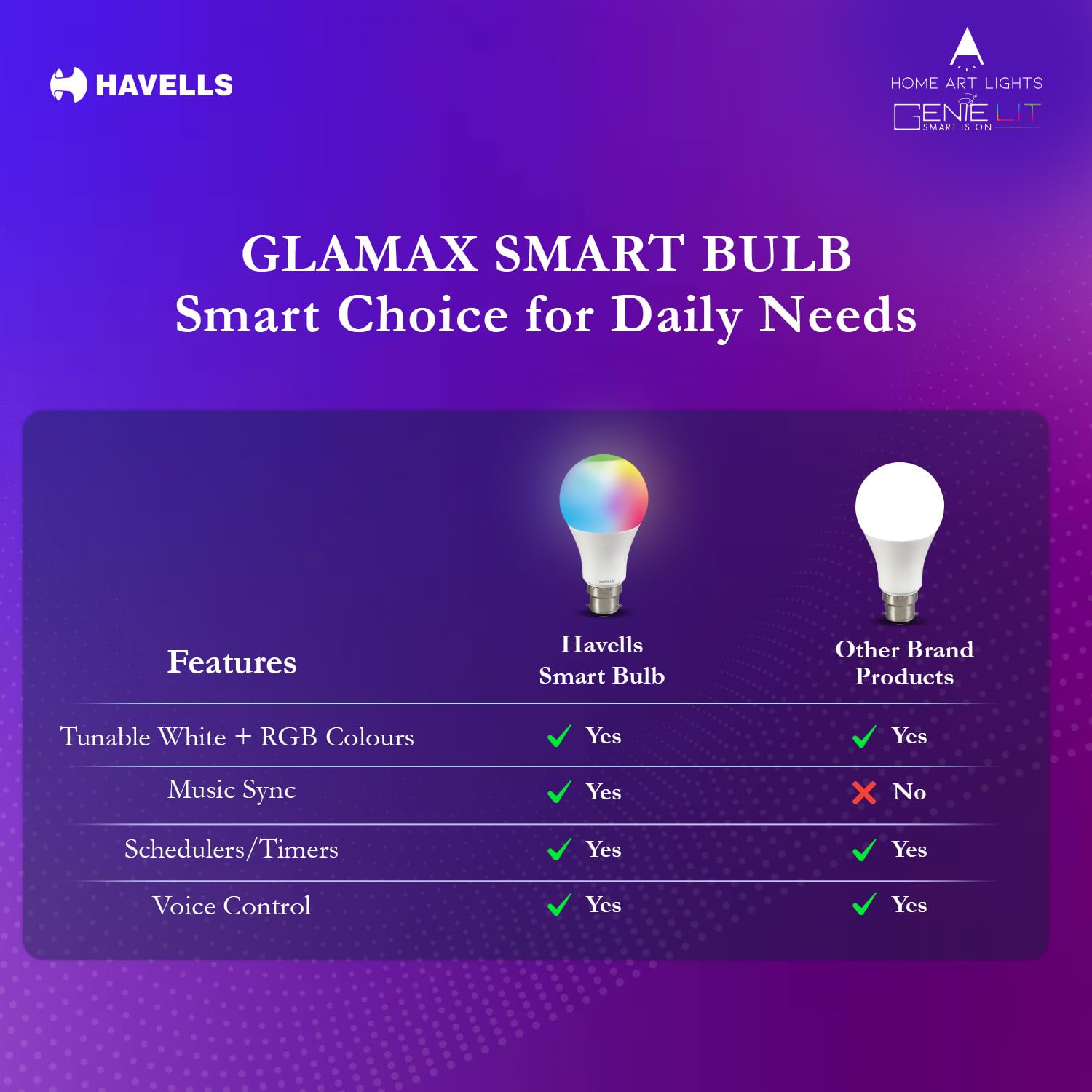 Be the first to review “Havells Glamax 9W B22 WiFi LED Smart Bulb with Music Sync Function, Compatible with Amazon Alexa and Google Assistant (16M Colours)”