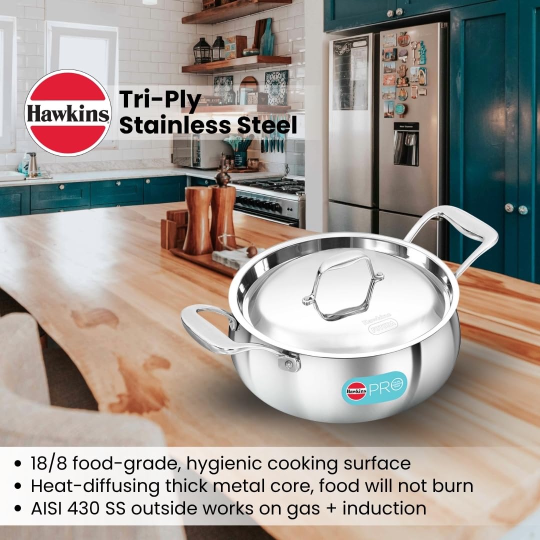 Hawkins Pro Triply Stainless Steel Handi is engineered for culinary excellence, achieving professional results every time. A contemporary take on the classic Indian cooking vessel renowned for its ability to infuse flavors through minimal water usage. Boasting a unique curved body, this Handi simplifies the stirring process. From pulao and biryani to vegetables, dals, soups, stews, curries, and desserts, this versatile Handi accommodates a wide array of culinary creations. Designed for your comfort and safety, the stay-cool handle allows for easy and secure handling, even when the pan is hot. Whether you’re using gas, induction, or the oven, this Handi adapts effortlessly to various cooking methods, offering versatility and convenience in the kitchen. The Stainless Steel rivets ensure that the Handi remains sturdy and stable, preventing any concerns about loosening or durability. The thick Stainless Steel lid comes with stay-cool handle. The pan is dishwasher safe, making maintenance a breeze and freeing up more time for culinary creativity.