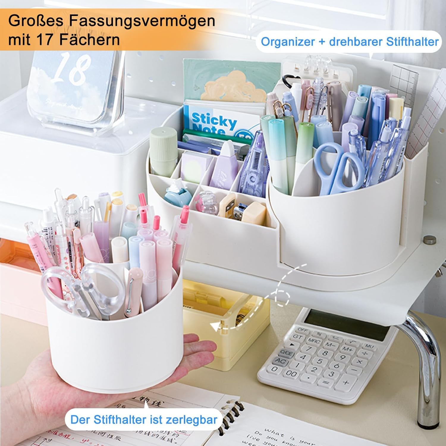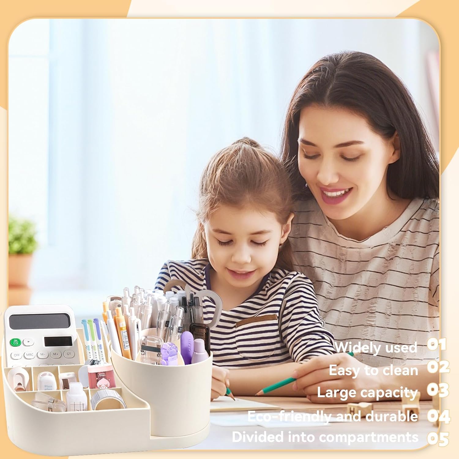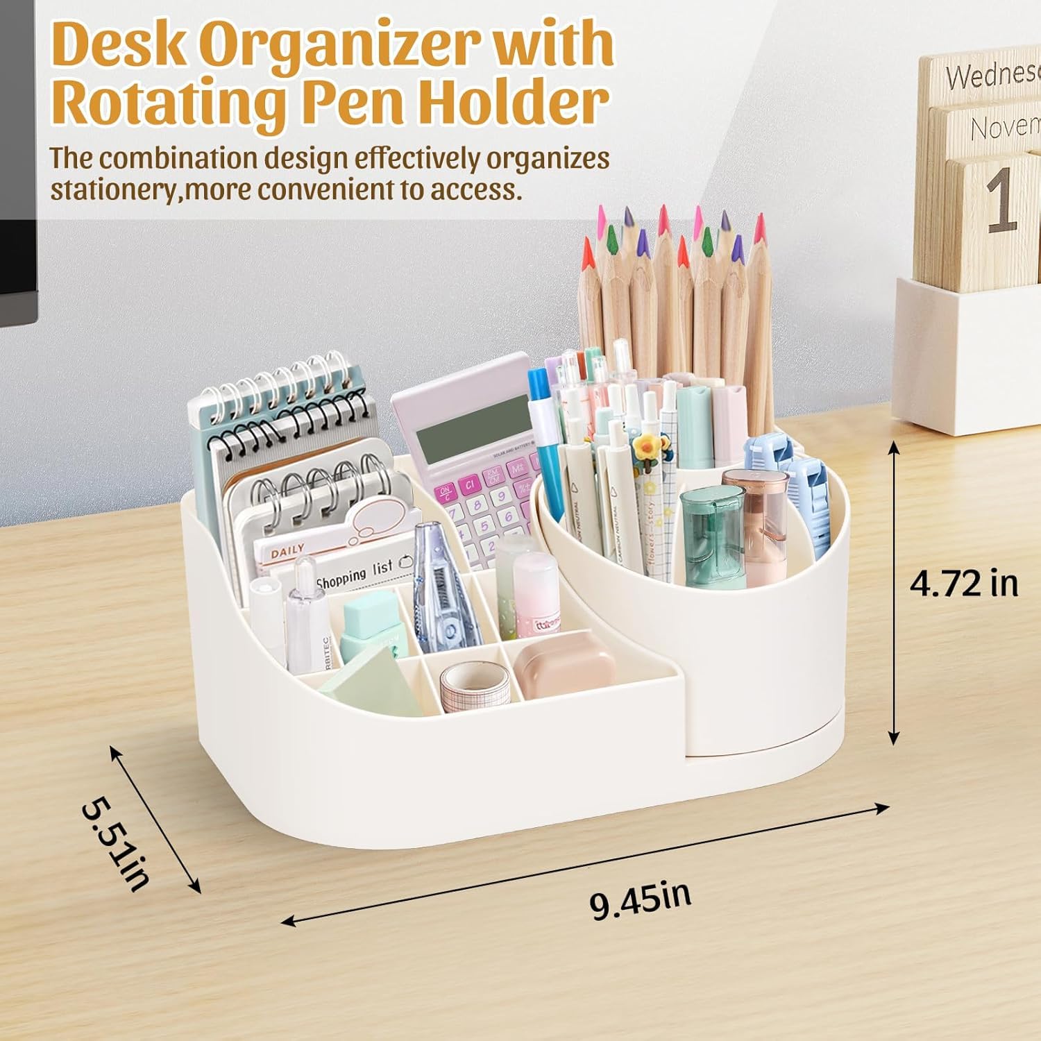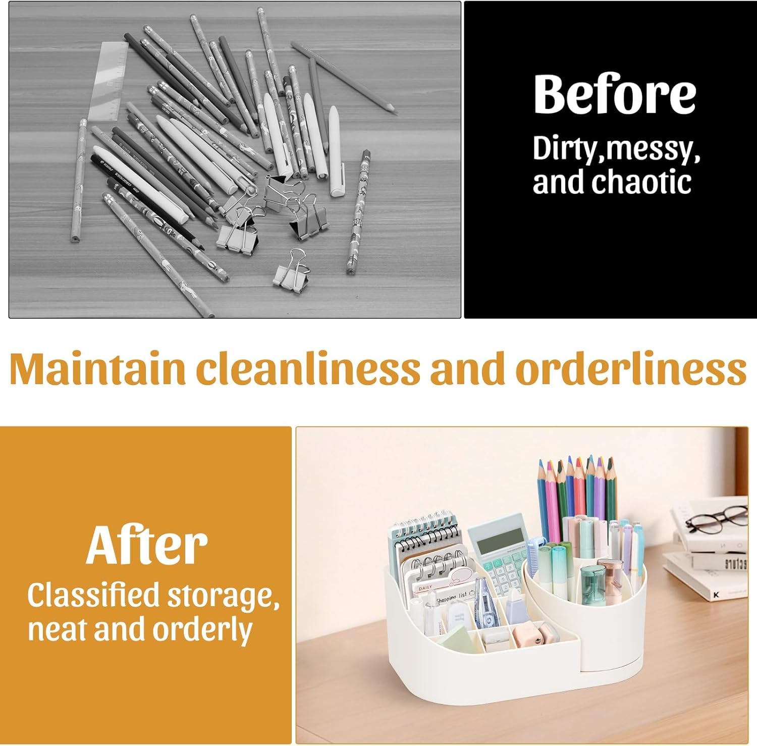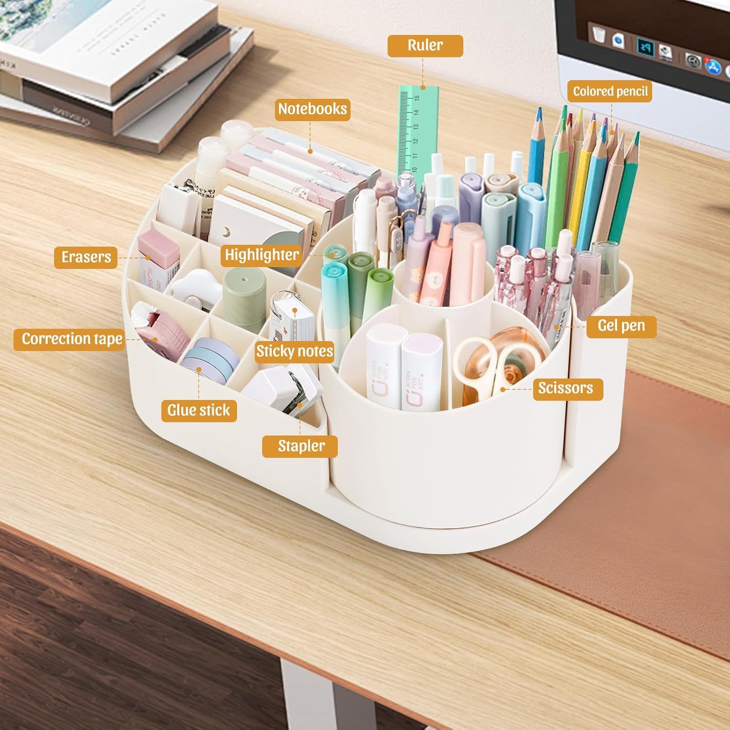 360 degree rotatable design:The 360 degree rotating pen holder organizer makes easier for you to organize and get the supplies on your desk, it spins smoothly all around without getting stuck. Easy to get from any angle, so that you can easily arrange your paint brushes, pens, colored pencils, scissors, crayons,eraser. keeps your stationery supplies organized and easy to find, and enables you to improve your working efficiency.