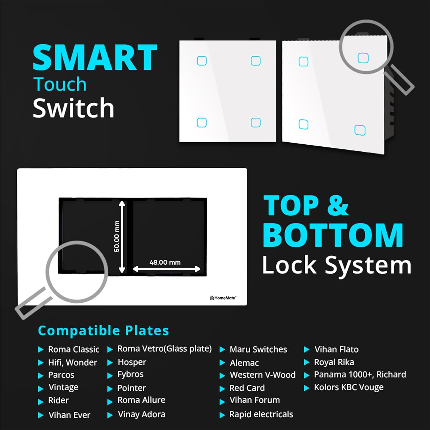 Wide Plate Compatibility: Compatible with multiple switch plate brands, including HomeMate, Roma Classic, Vinay Adora, Kolors KBC Vouge, Western Vintage, and more. Premium Touch Design: Features a sleek, modern white glass panel for a sophisticated look in any room.