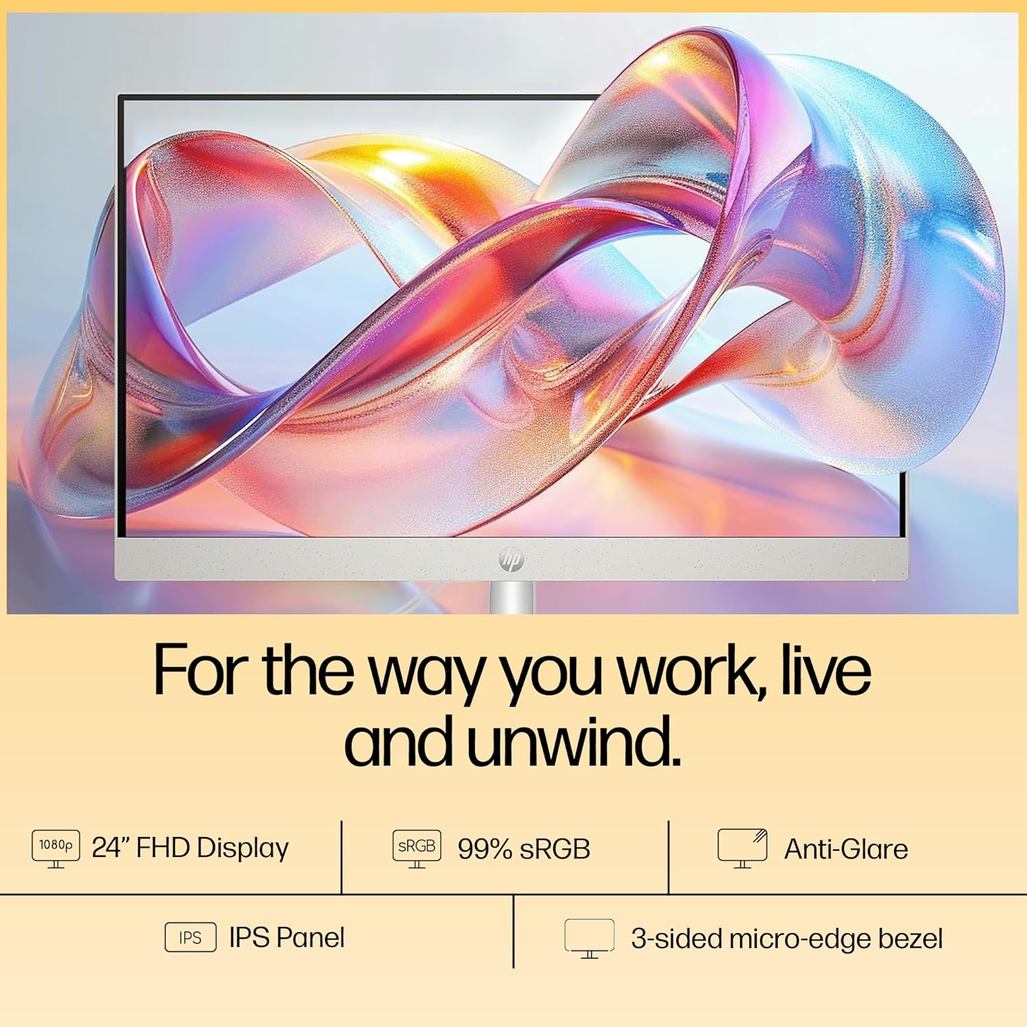 Display & Graphics: 60.5 cm (23.8″) diagonal, FHD (1920 x 1080), IPS, three-sided micro-edge, anti-glare, 250 nits, 99% sRGB| Graphics: AMD Radeon Graphics