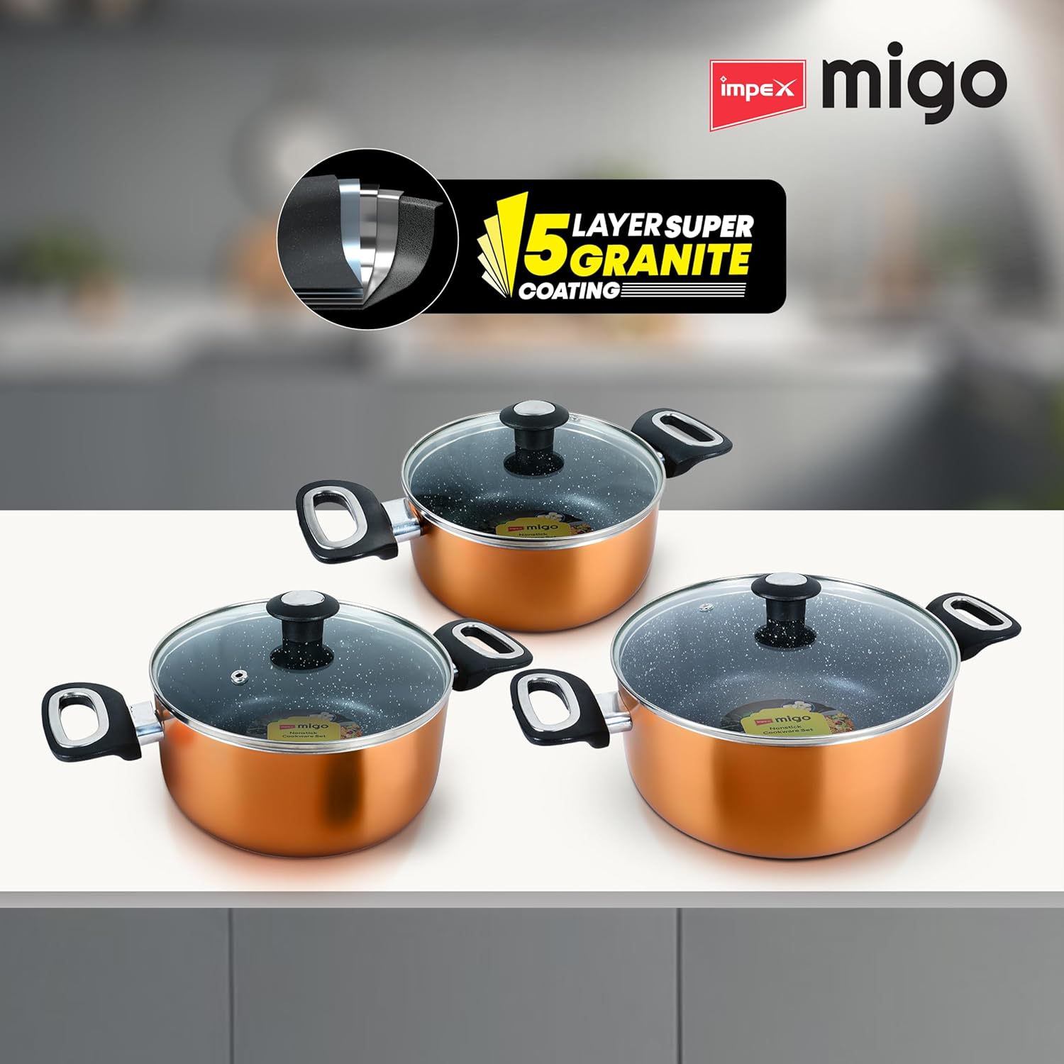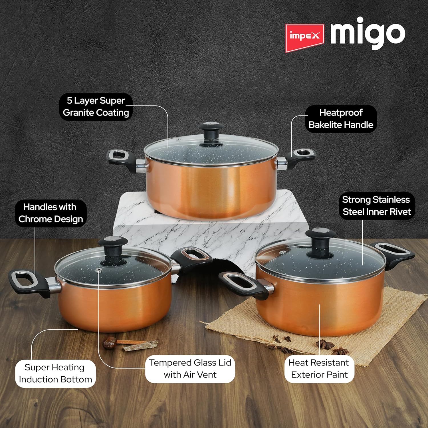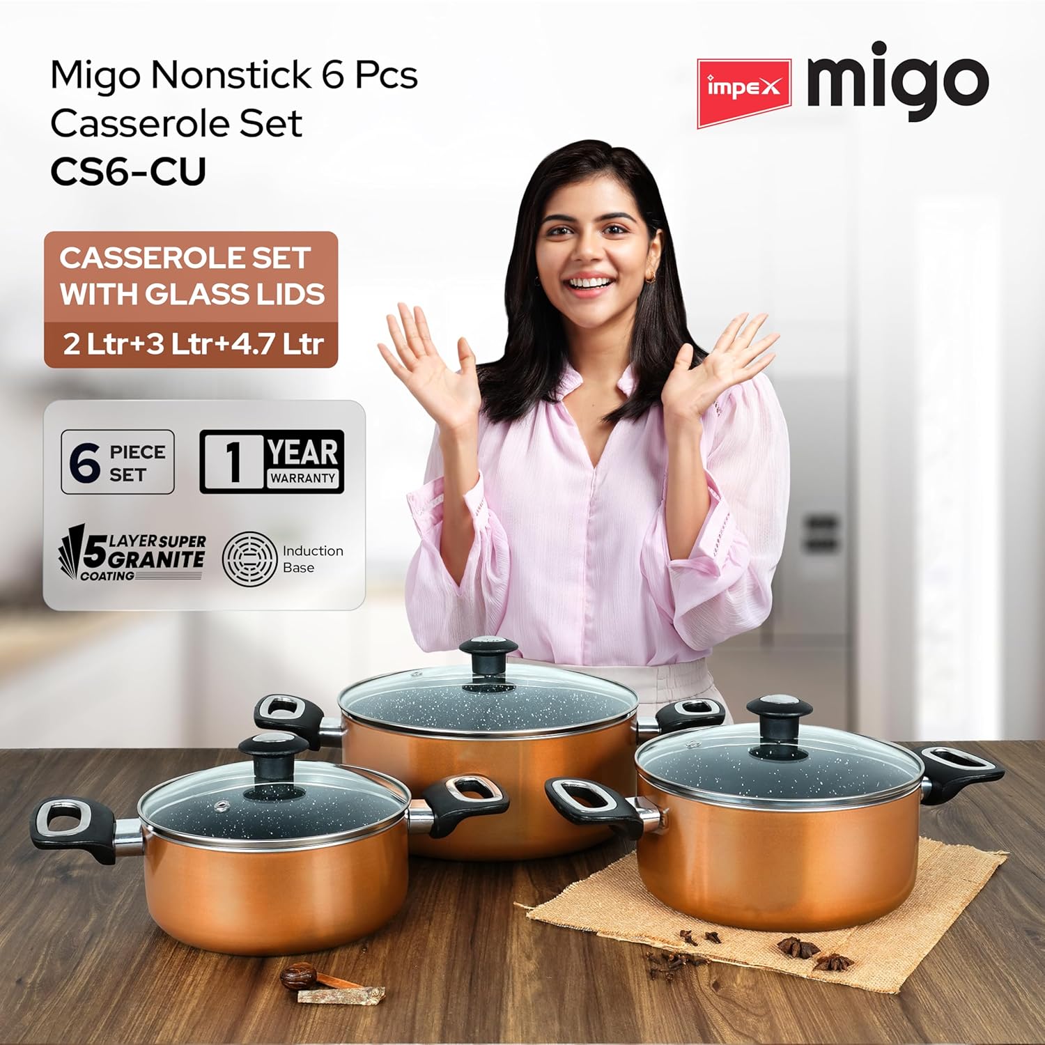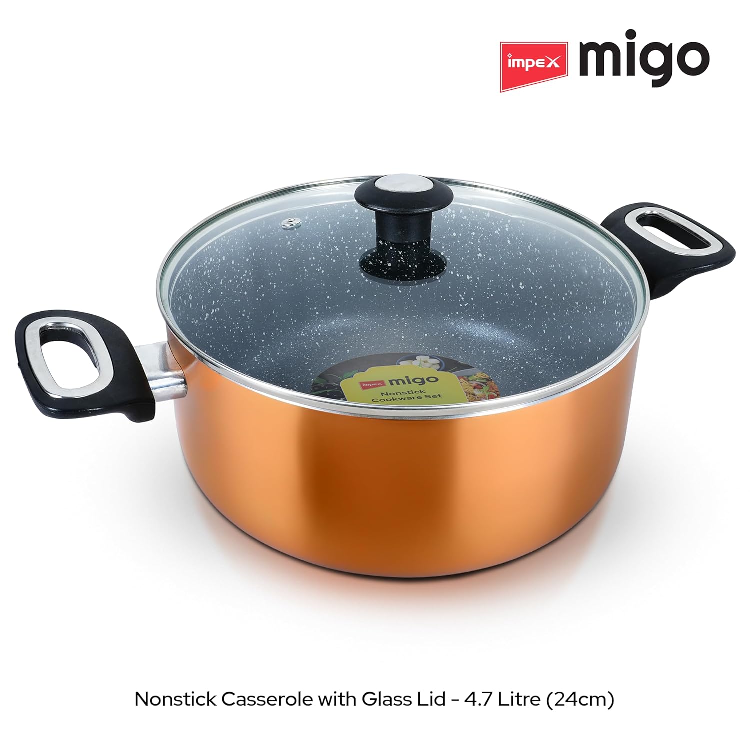 Impex Cook and Serve Casserole Set 6 Pcs Nonstick Granite Cookware Set with Glass Lid | Sauce Pans Combo with Induction Bottom | Non-Stick Cookware Set | Aluminium Casserole Set 4.7L, 3L and 2 liter