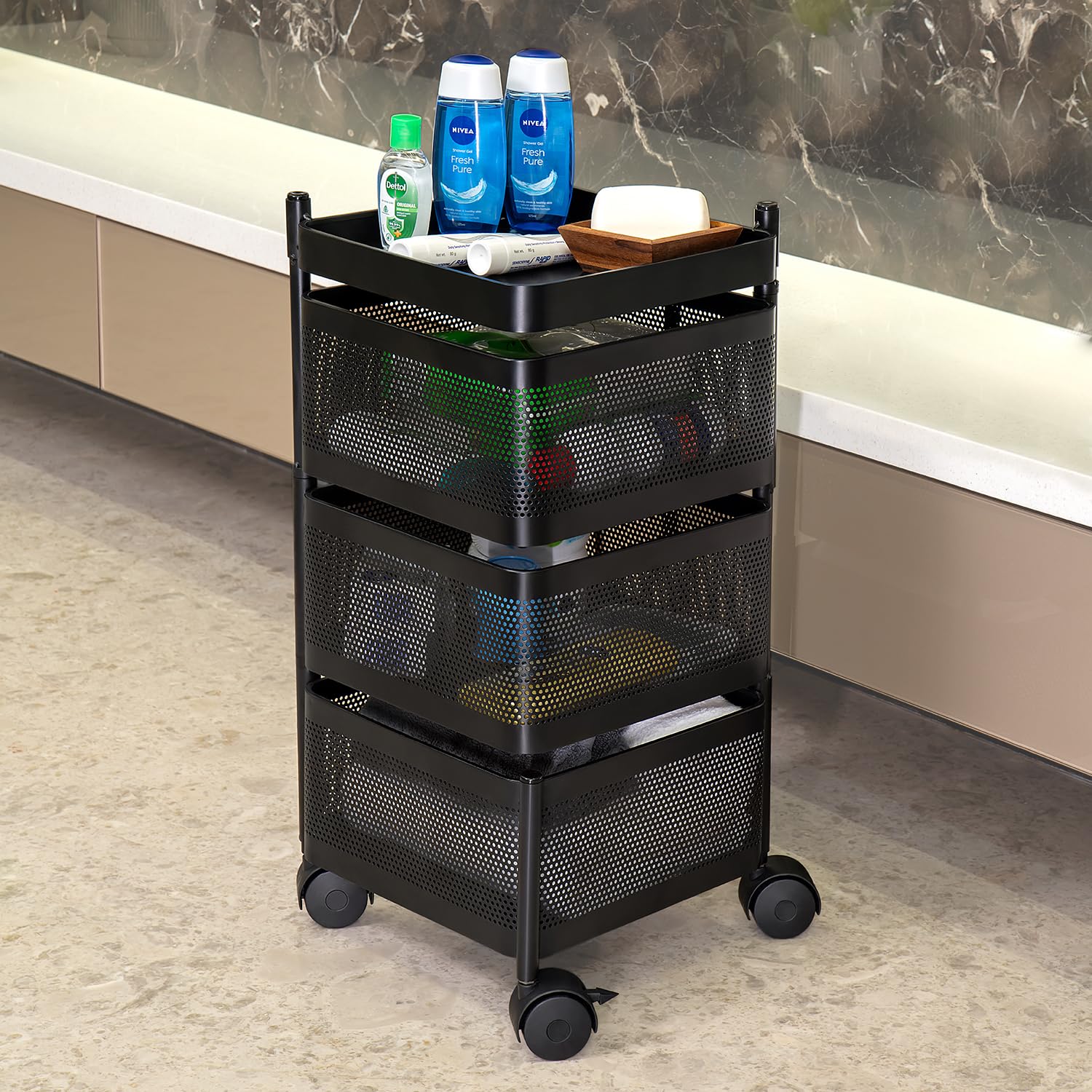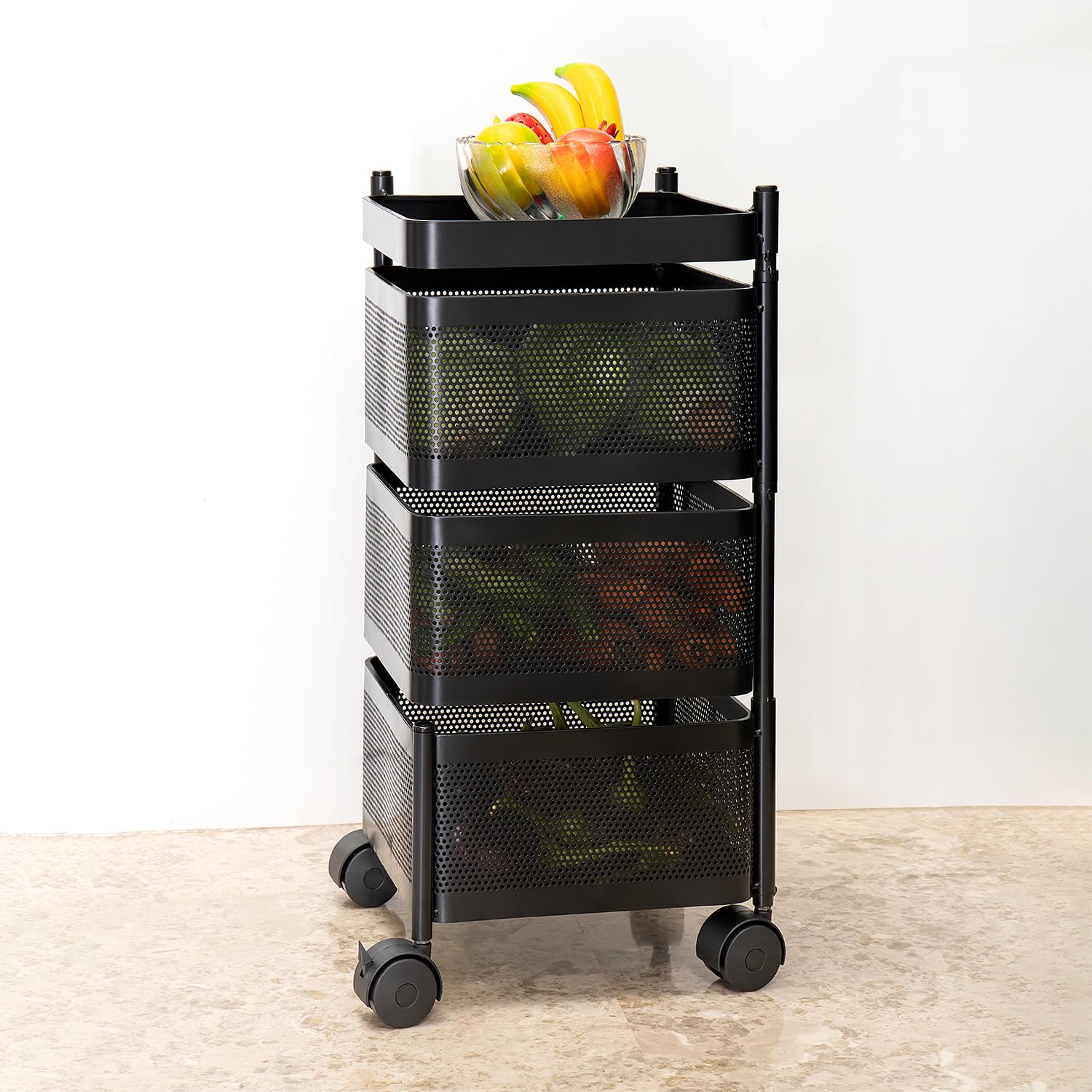 The trolley rotates freely 360° with 2 lockable universal rollers at the bottom, which help the cart can move freely and turn effortlessly stop the cart in small spaces. Easy to clean, just wipe it with a wet towel.