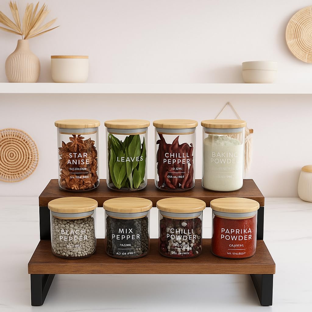 Bring style and functionality together with this beautifully crafted wooden spice rack. The warm rustic finish paired with a sleek metal frame adds a decorative touch to your countertop while keeping everyday essentials within easy reach. From spices and condiments to tea bags and small jars, everything stays neatly arranged, organised, and ready to use—no more messy counters or scattered bottles.