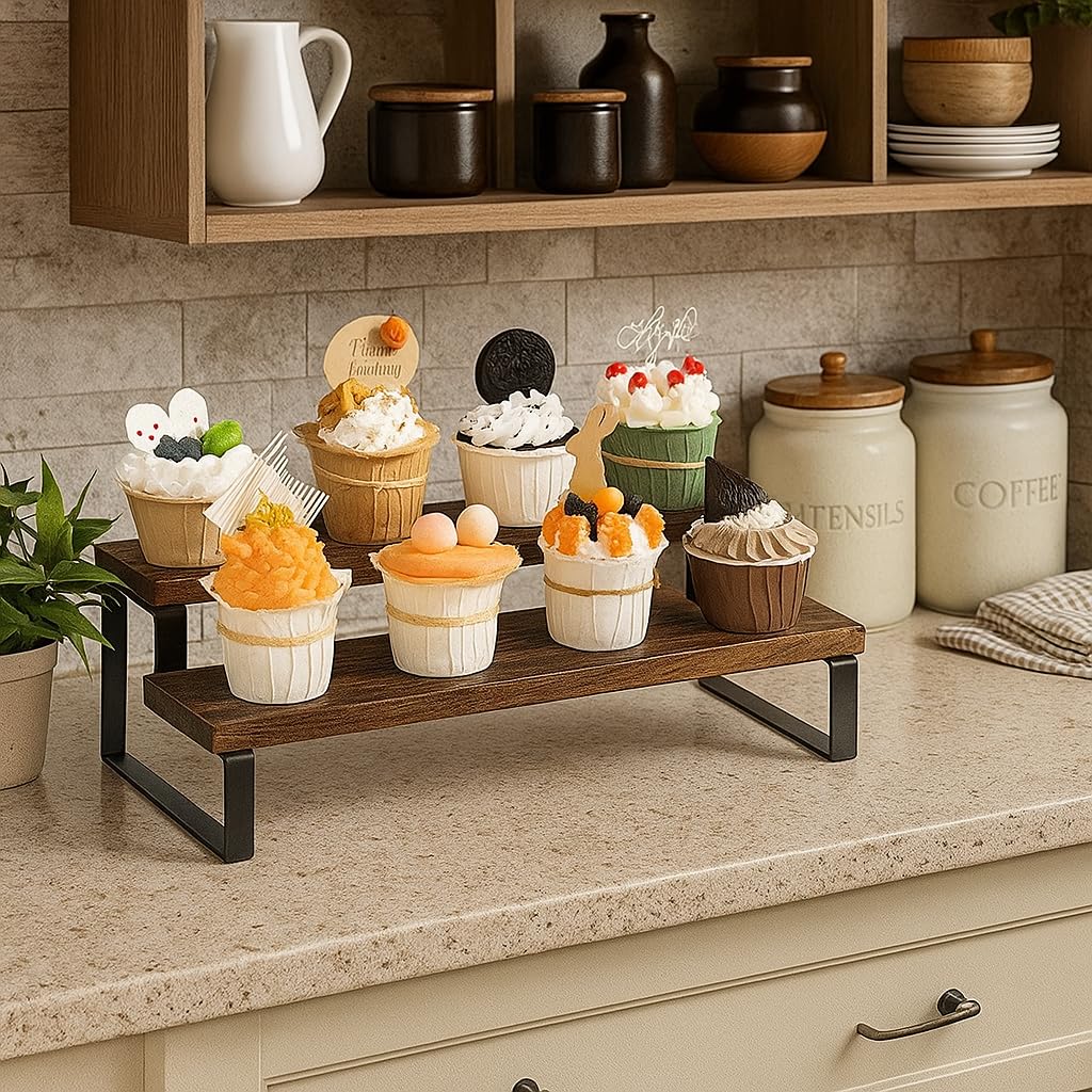 Kundi Rustic Wood Spice Rack Shelf – 2-Tier Kitchen Organizer (Dark Brown, 30 x 15 x 15 cm) Add charm and organization to your kitchen with this compact, rustic 2-tier spice rack. Designed with a warm wooden finish and a sturdy black metal frame, it saves counter space while keeping bottles, jars, sauces, tea, and condiments neatly arranged. Smooth shelves with raised edges prevent slips and make cleaning easy. Perfect for kitchens, countertops, pantries, and even bathrooms or dressing tables.