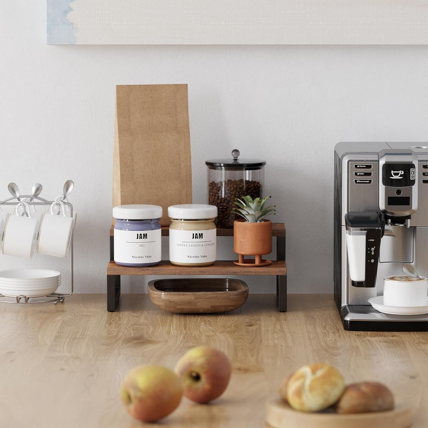 Chic & Compact: Thoughtfully designed with a rustic wood finish and a sleek black frame, this rack adds charm without taking up too much counter space.