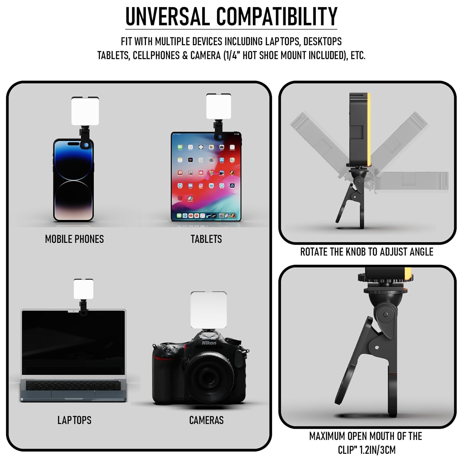 📎 Clip-On Design for Maximum Flexibility Featuring a 180° rotatable clip, this light securely attaches to phones, tablets, laptops, and more. The non-slip pads protect your devices from scratches while ensuring a firm hold—perfect for video shooting youtube, Zoom meetings, online classes, or live streaming.