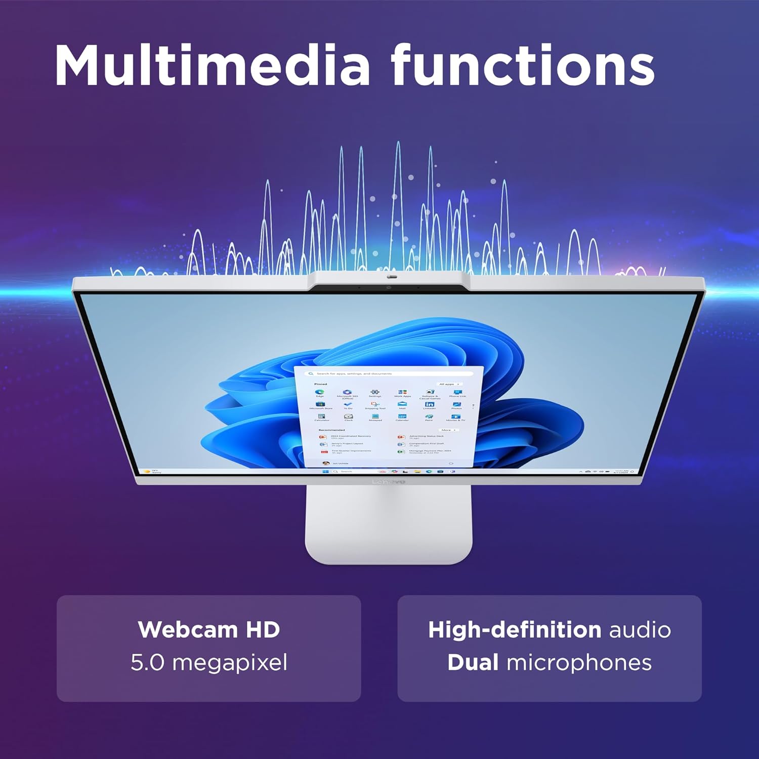 Lenovo A100 The essential PC for your home. Blend style with functionality for your home with this sleek all-in-one desktop. This space-saving unibody design features a stunning 23.8″ FHD display with ultra-thin 3-side bezels. Powered by an Intel® N100 processor, the Lenovo A100 is perfect for everyday tasks at a great value Intel®-powered for clear calls, easy tasks Powered by Intel® N100 processors and up to 16GB memory, the Lenovo A100 makes daily tasks a breeze. Host seamless video calls with crystal-clear audio on the optional 5MP webcam and dual mic setup. Stunning display for your movie night Going through your photo albums becomes a feast. Dive into stunning and sharp images on the 23.8″ Full-HD display with 3-side thin bezels and 99% sRGB color gamut at 1300:1 color contrast. Multi-screen with versatile ports Four USB-A ports offer versatile connectivity that keeps you ready for work, play, and everything in between. Expand your workspace with the HDMI output for dual displays. Connect at lightning speeds with Wi-Fi 6 and effortlessly pair devices using Bluetooth® 5.2. Simplify your workspace with a sleek AIO Upgrade and simplify your workspace with this sleek, all-in-one design. Adjust the stand (-5° to 25°) for the perfect viewing angle. The sleek Cloud Grey finish adds style to any room.